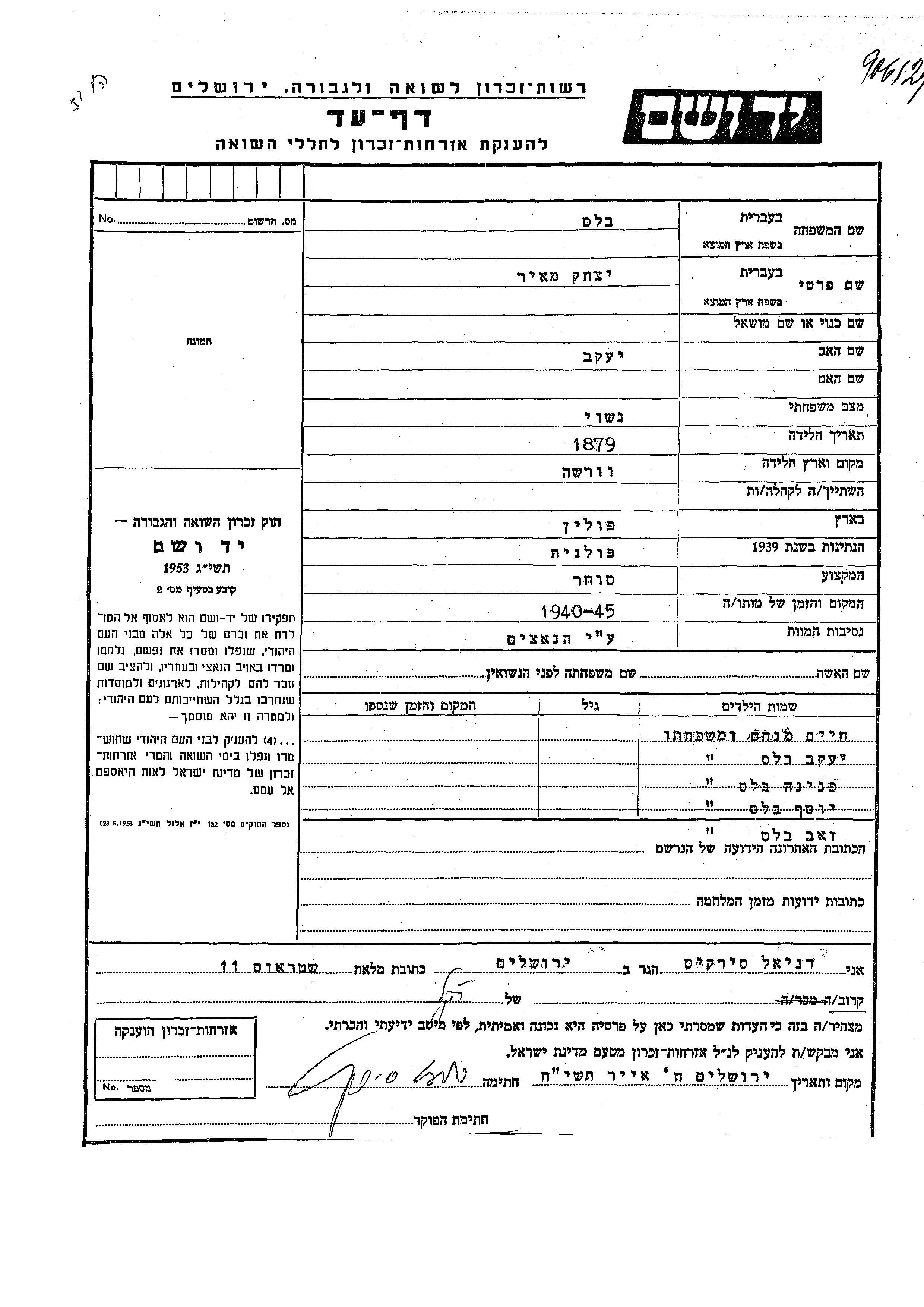 Blas Yaakov endroit inconnu, Feuille de témoignage