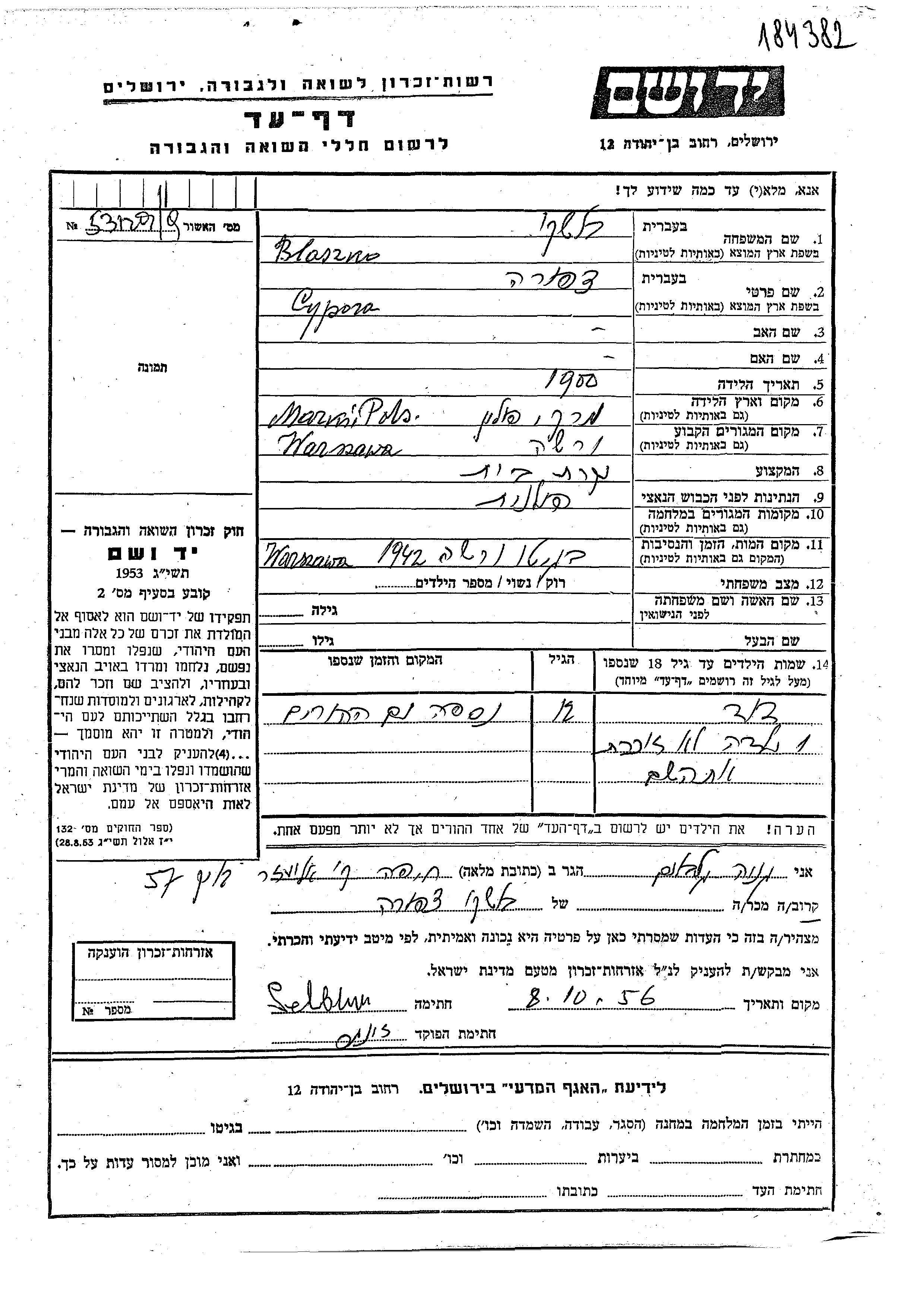 Blaszko Blashko David Varsha, Pologne Feuille de témoignage