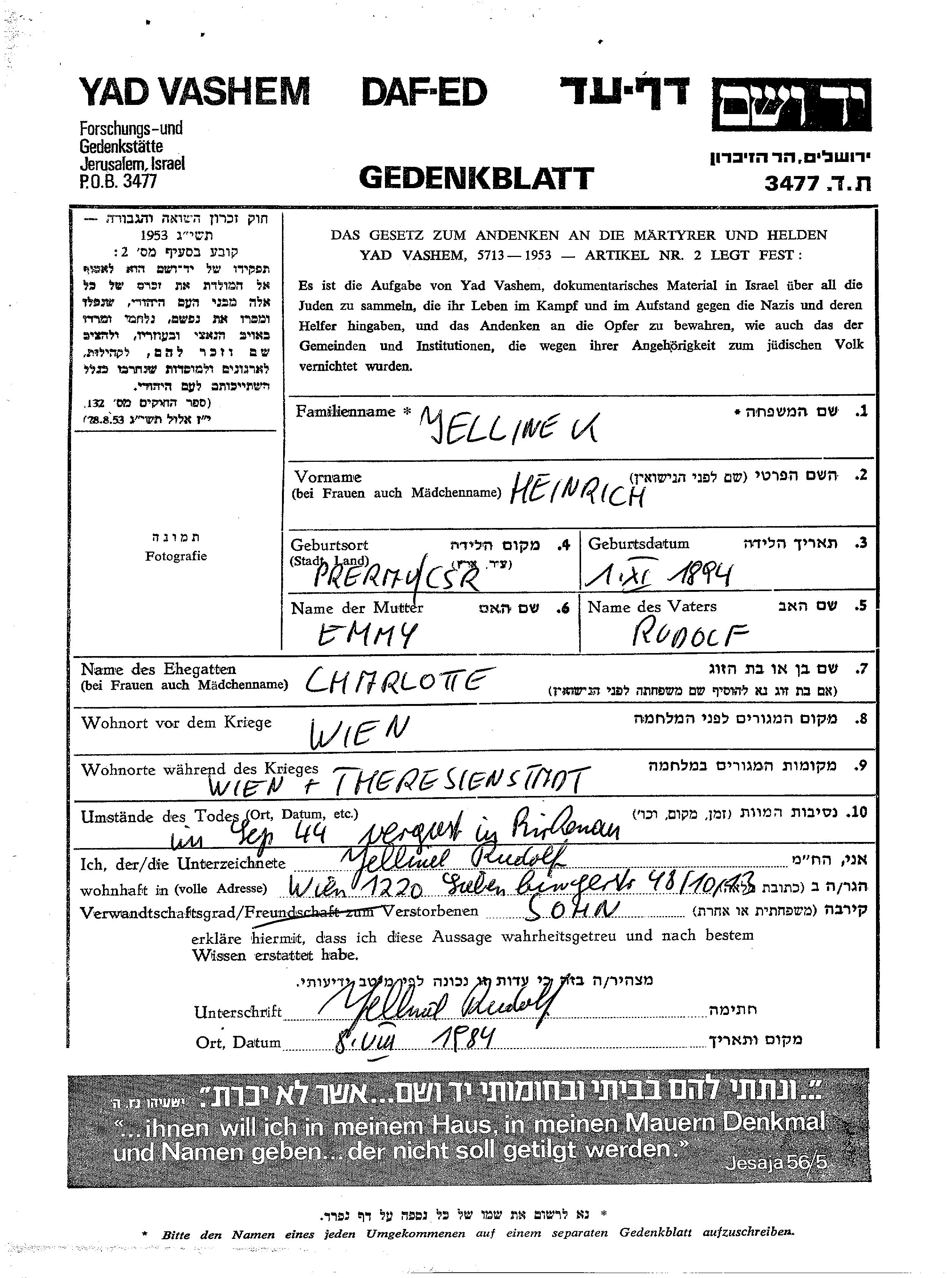 Heinrich Yellinek est né à Prerau, Tchécoslovaquie en 1894, fils de Rudolf et de Emmy. Il était Mariée à Charlotte. Avant la seconde guerre mondiale il vivait à Vienna, Autriche. Au cours de la guerre, il était à Theresienstadt, Tchécoslovaquie.