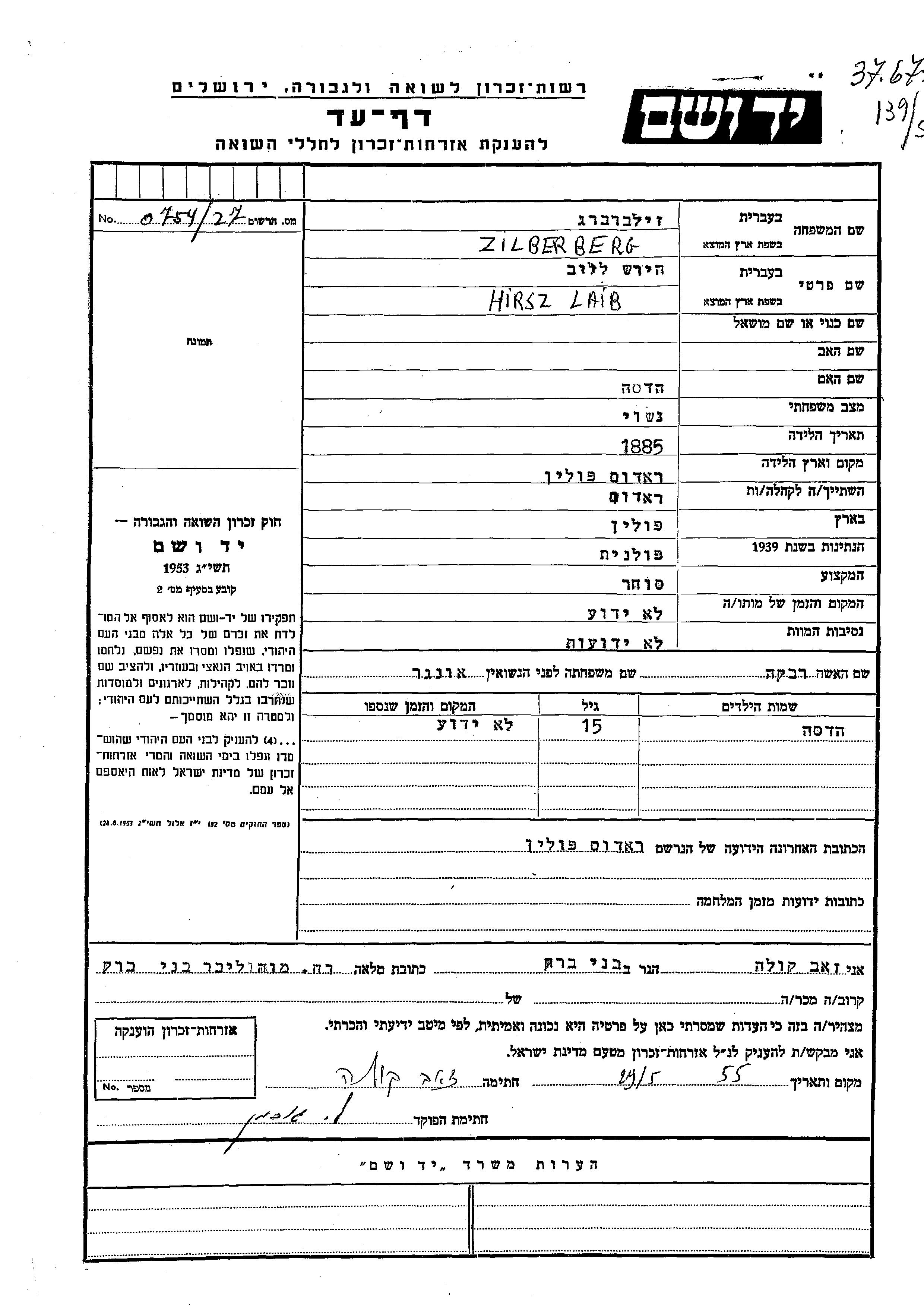 Zilberberg Hadasa endroit inconnu, Feuille de témoignage