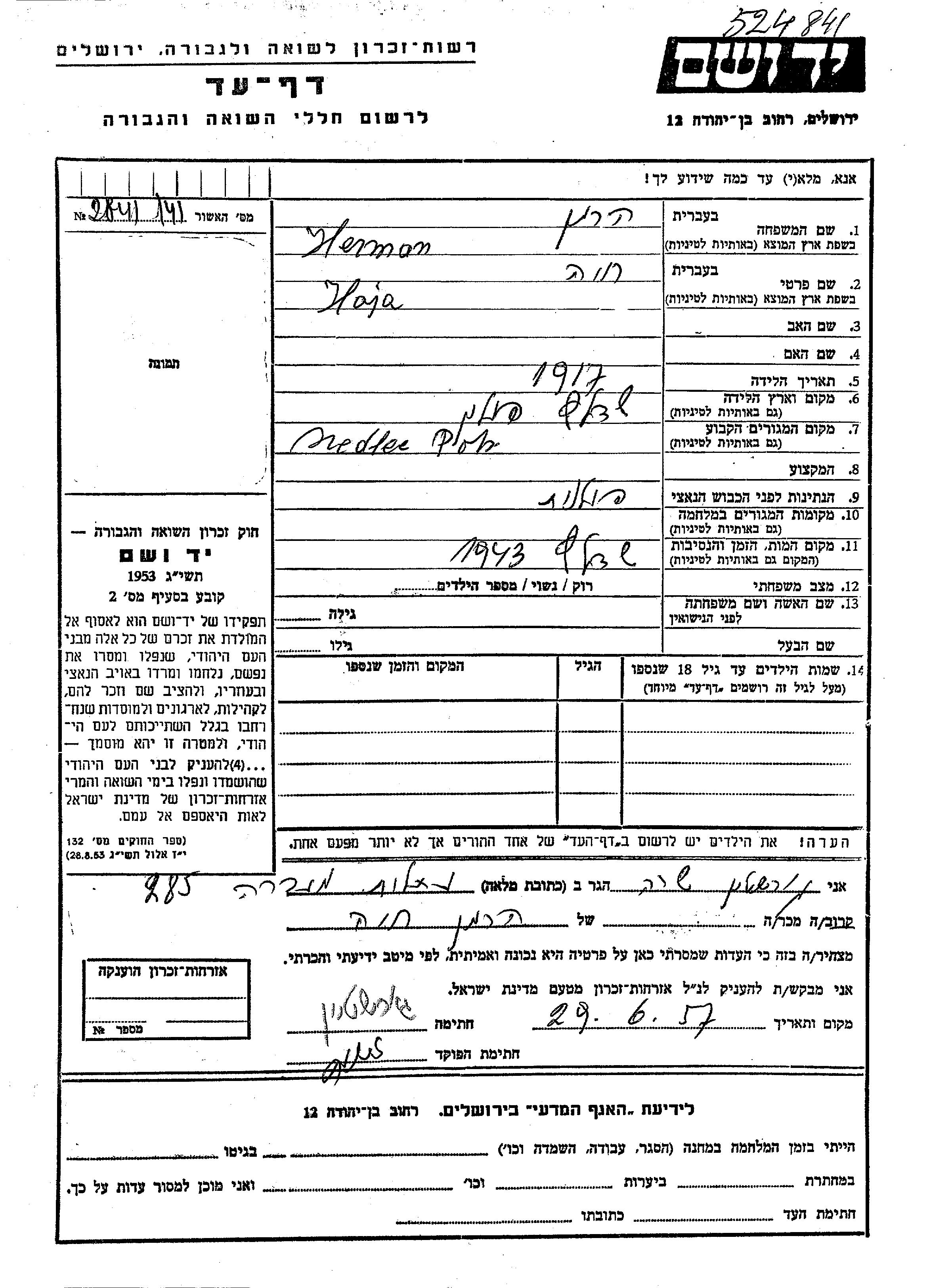 Herman Haja 1917 Szedlec, Pologne Feuille de témoignage