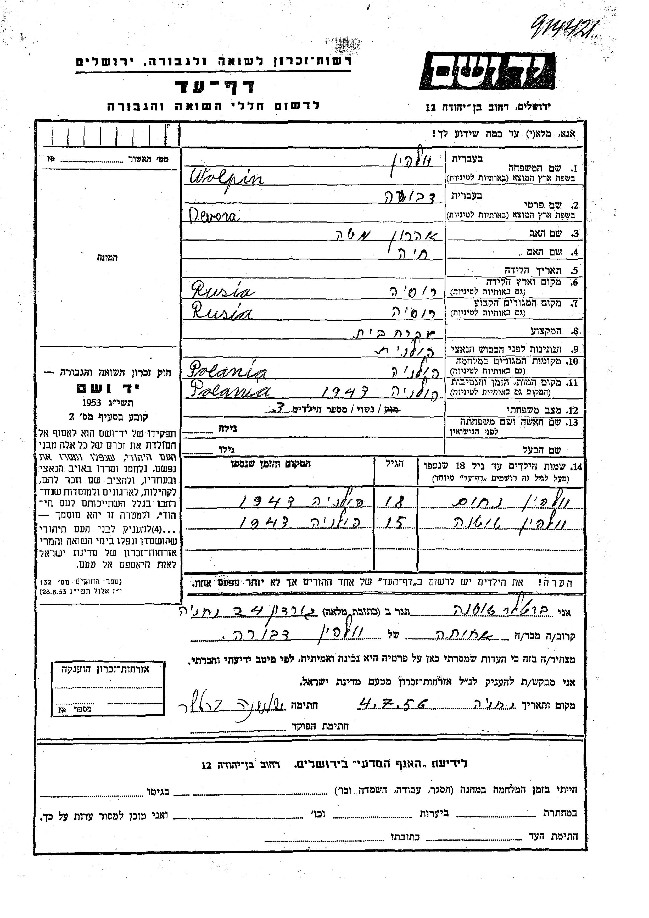 Yad Vashem - Pages of Testimony Names Memorial Collection