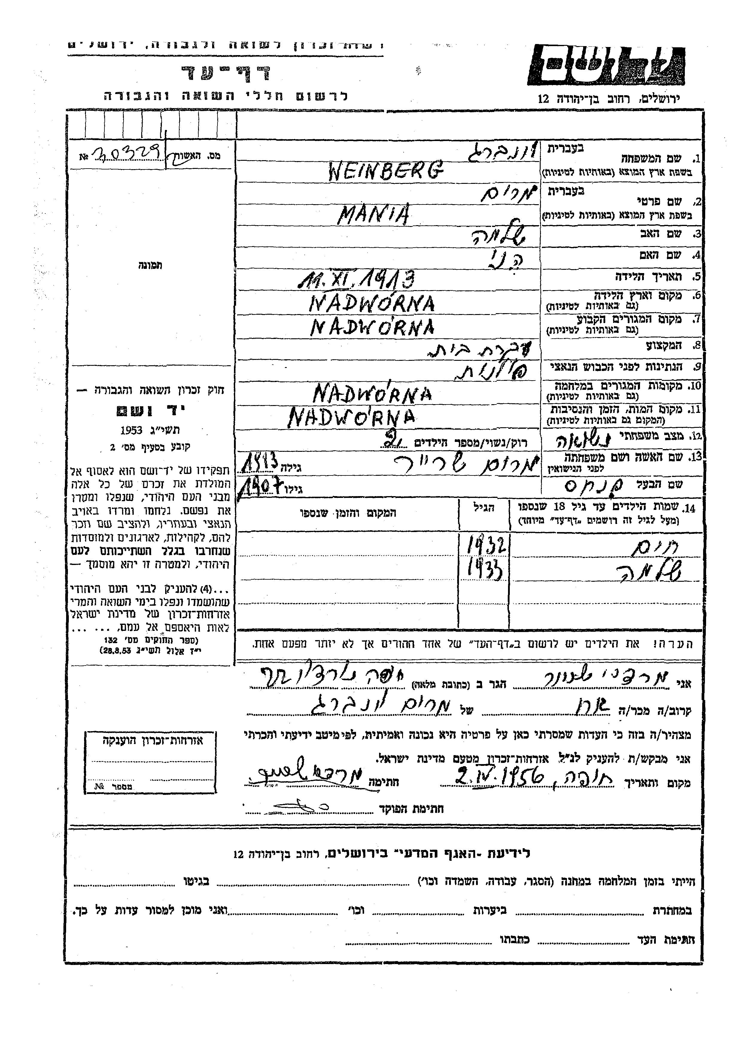 Khaim Weinberg est né en 1932, fils de Pinkhas et de Mania Miriam née Shreier. Il était Enfant. Avant la seconde guerre mondiale il vivait à Nadworna, Pologne. Au cours de la guerre, il était à Nadworna, Pologne.
