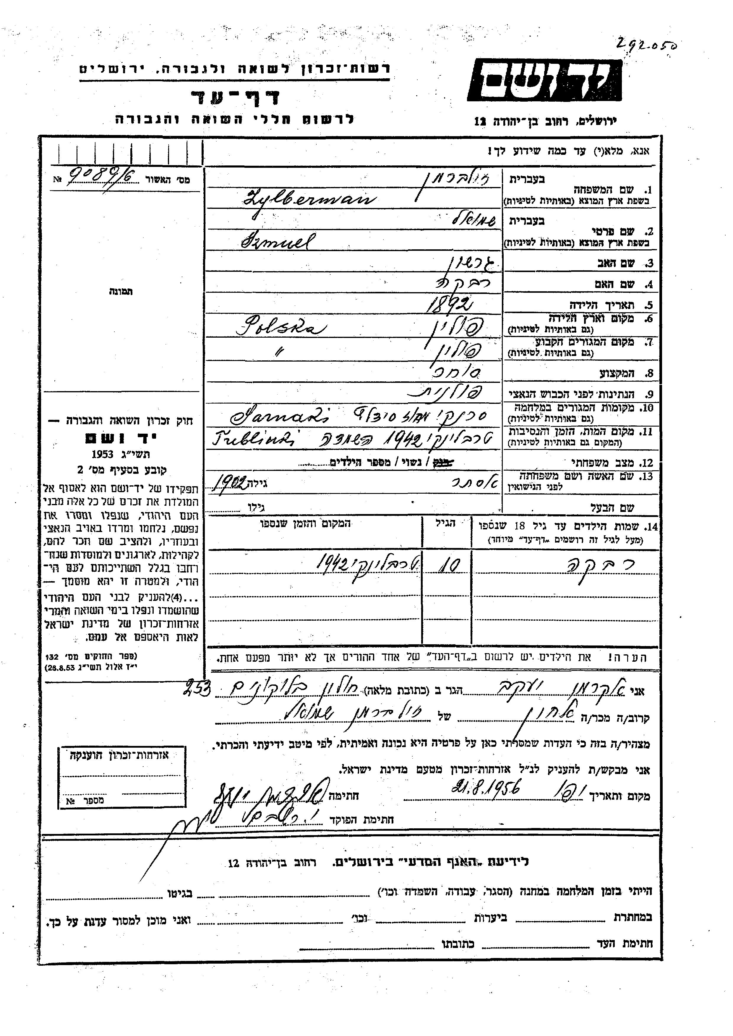 Zylberman Rivka Pologne Feuille de témoignage