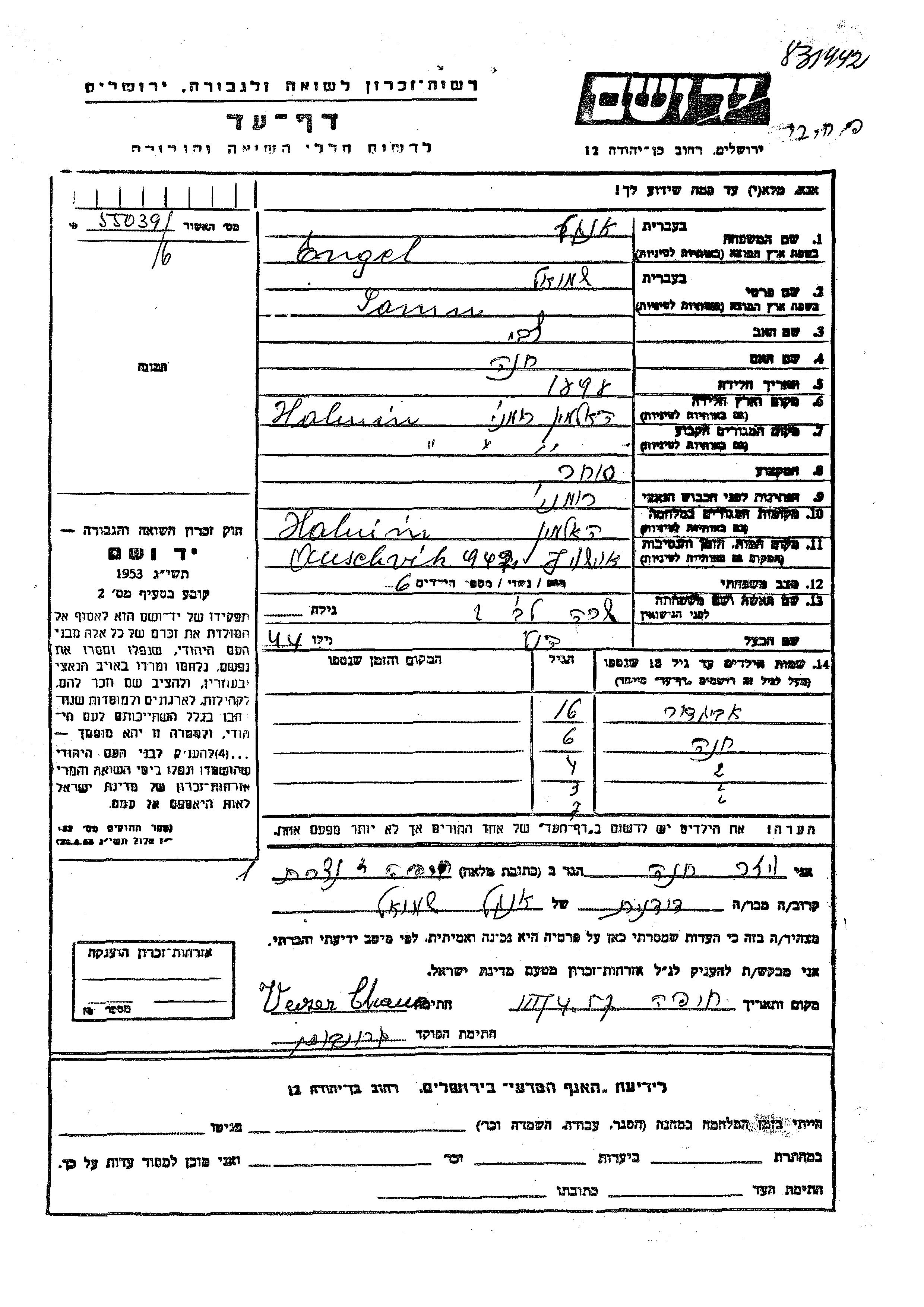 Engel prénom inconnu Halmin, Roumanie Feuille de témoignage