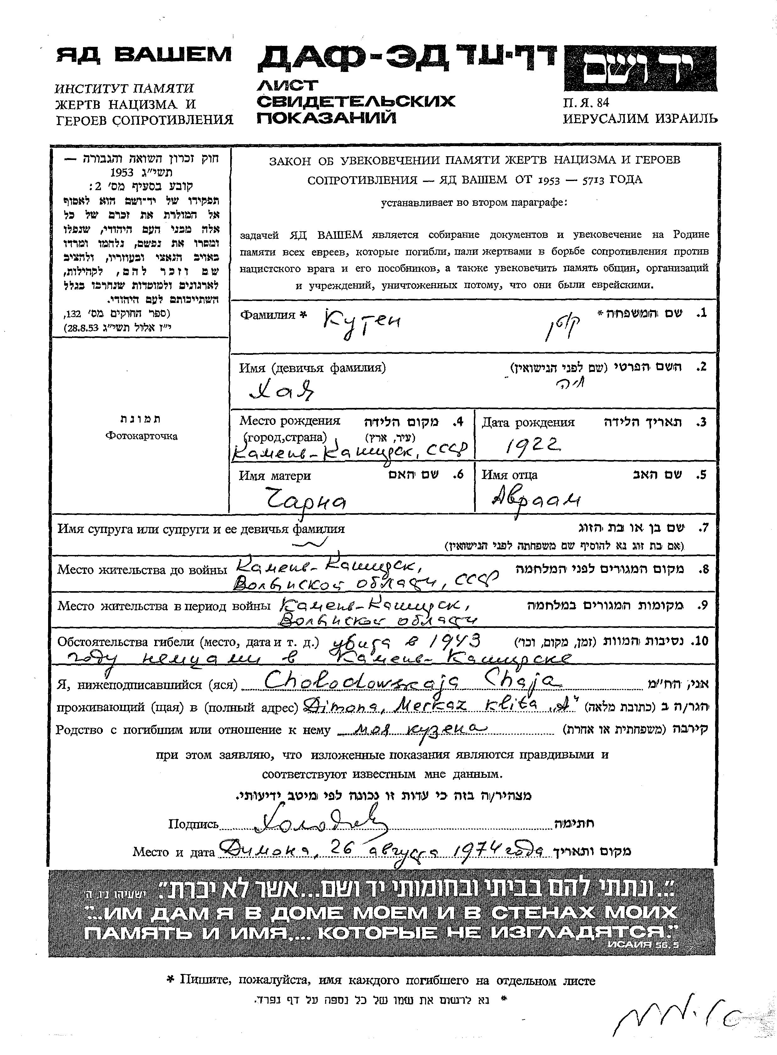 Kuten Khaia 1922 Kamen Kashirski, Pologne Feuille de témoignage