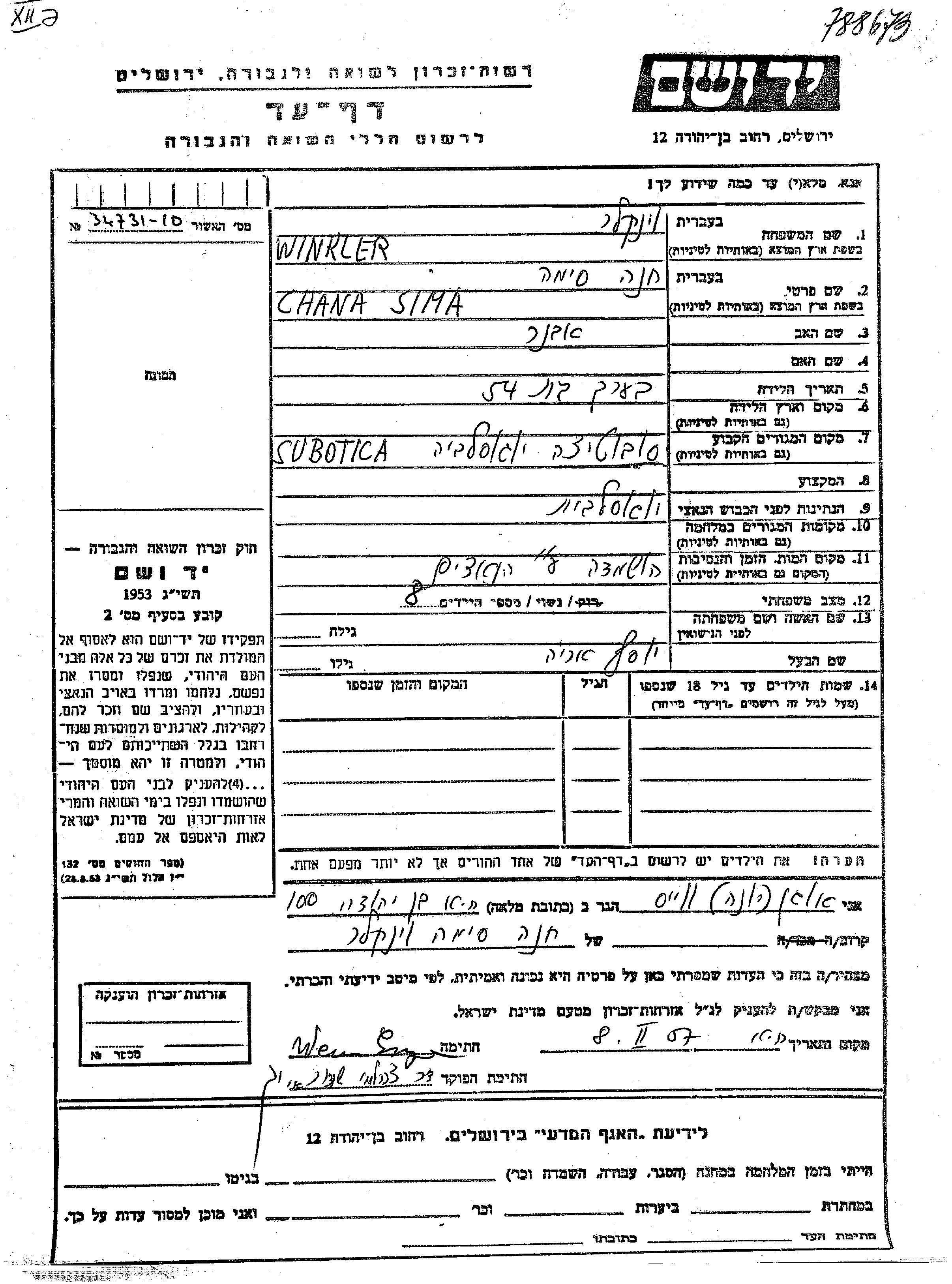Winkler Chana Sima endroit inconnu, Feuille de témoignage