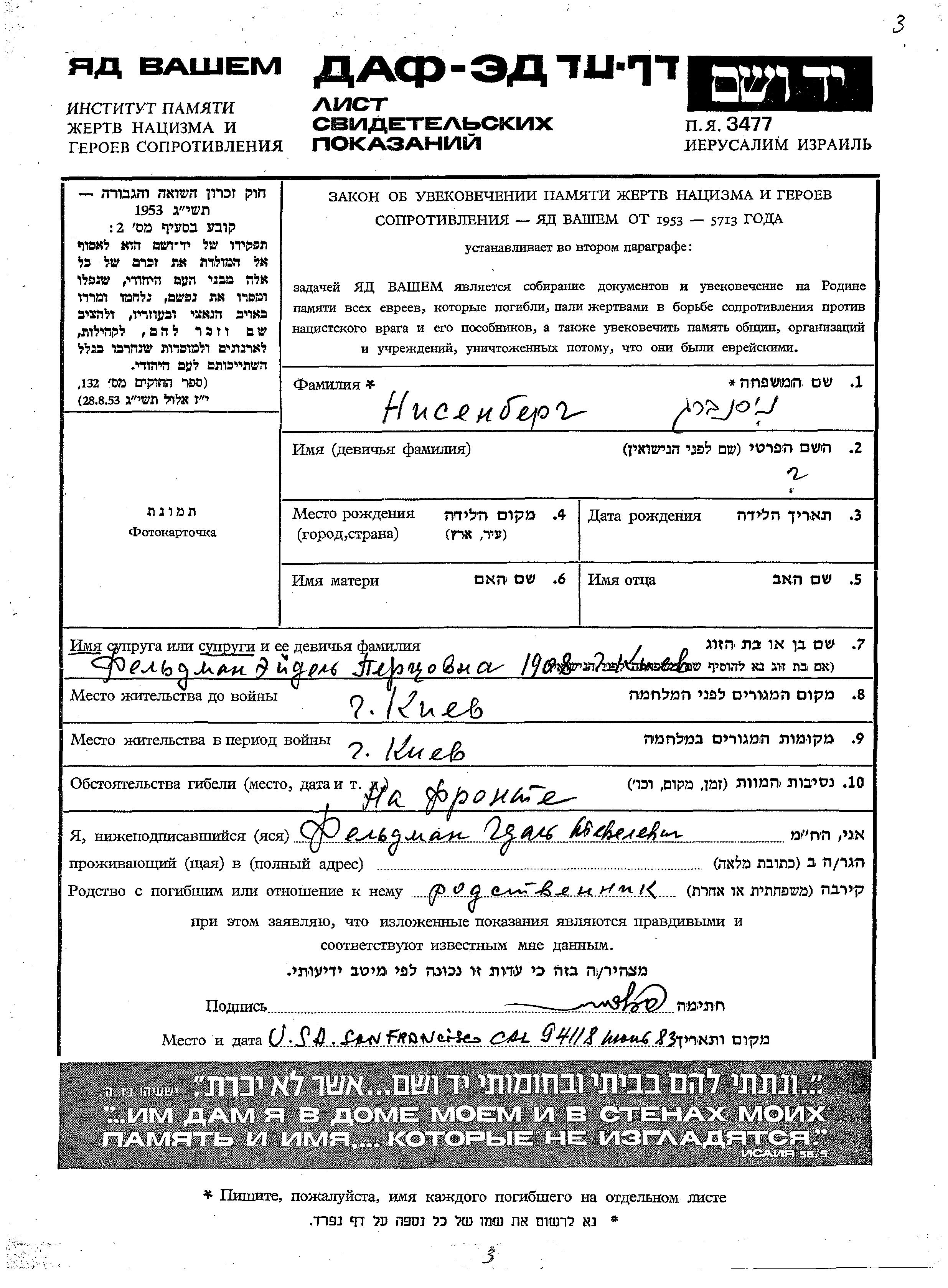 Nisenberg prénom inconnu Kiev, Ukraine (URSS) Feuille de témoignage