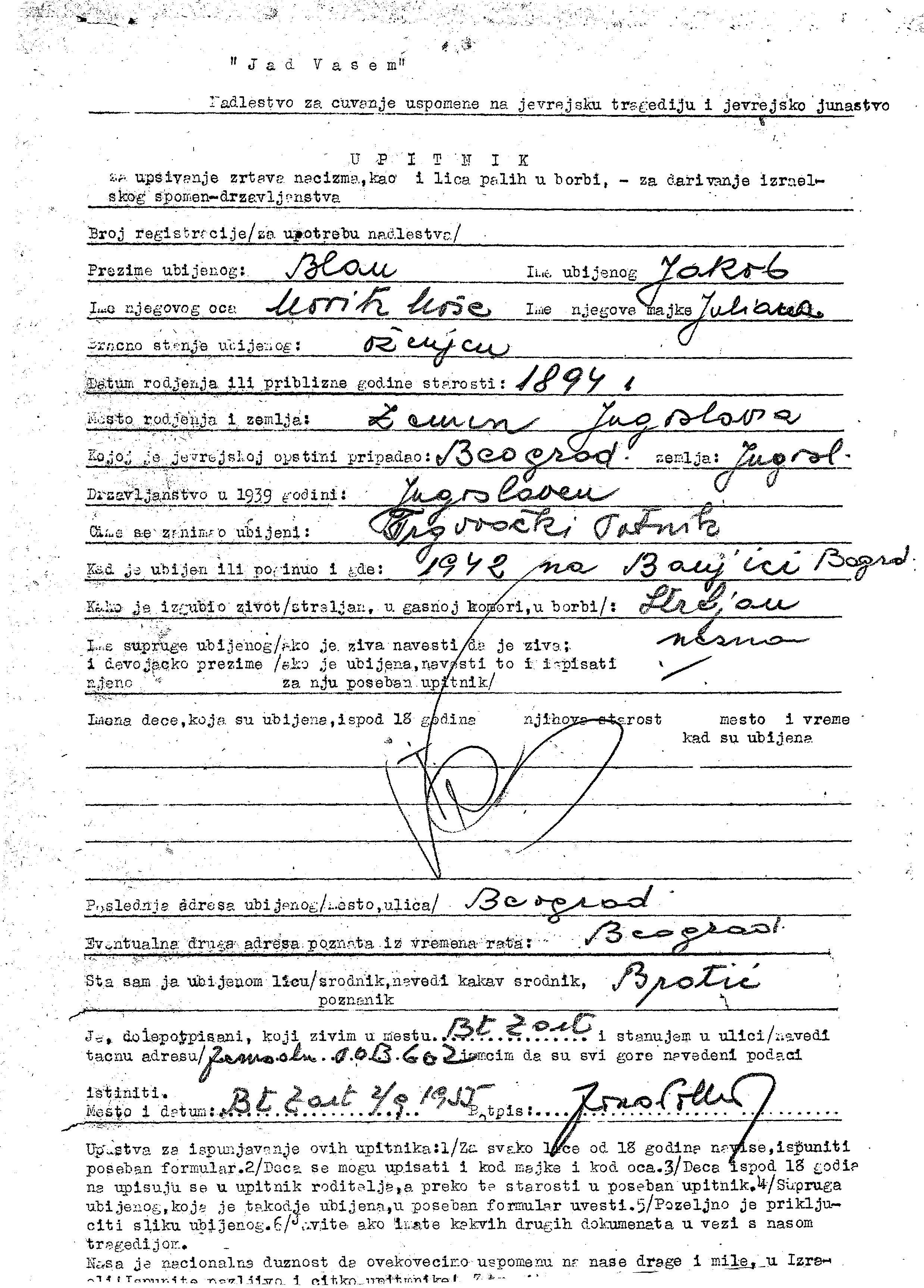 Blan Jakob 1894 Zemun, Yugoslavie Feuille de témoignage