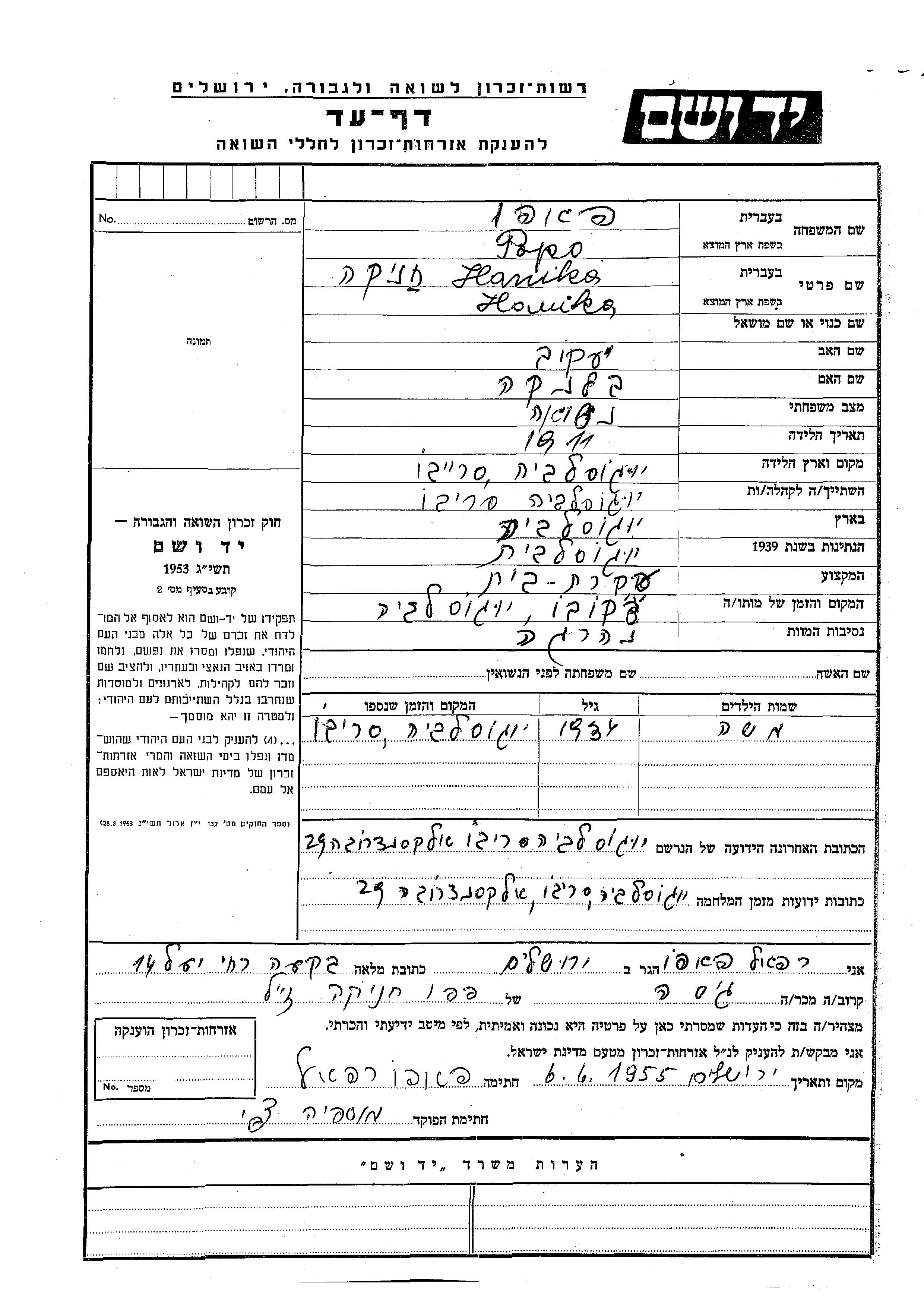 Papo Moshe 1934 Sarajevo, Yugoslavie Feuille de témoignage