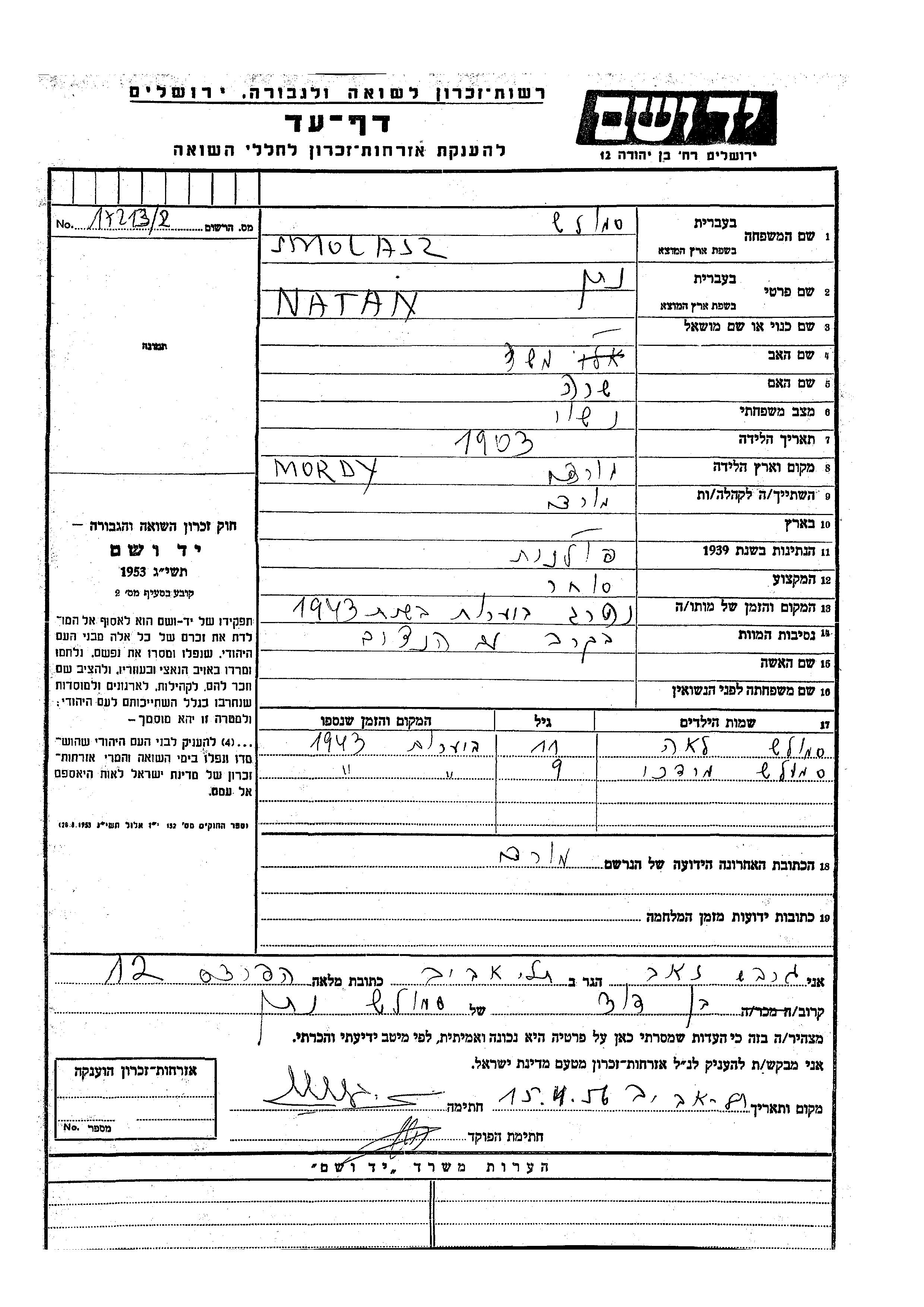 Smolasz Mordekhai endroit inconnu, Feuille de témoignage