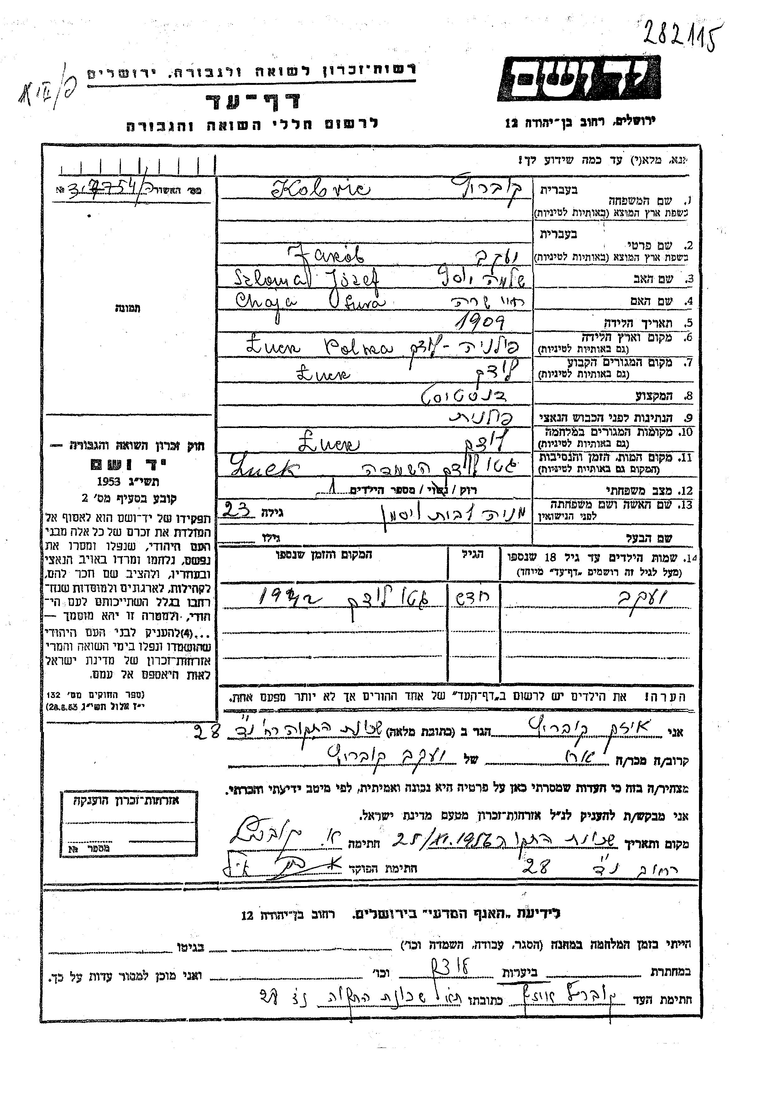 Kobric Yaakov Lock, Pologne Feuille de témoignage