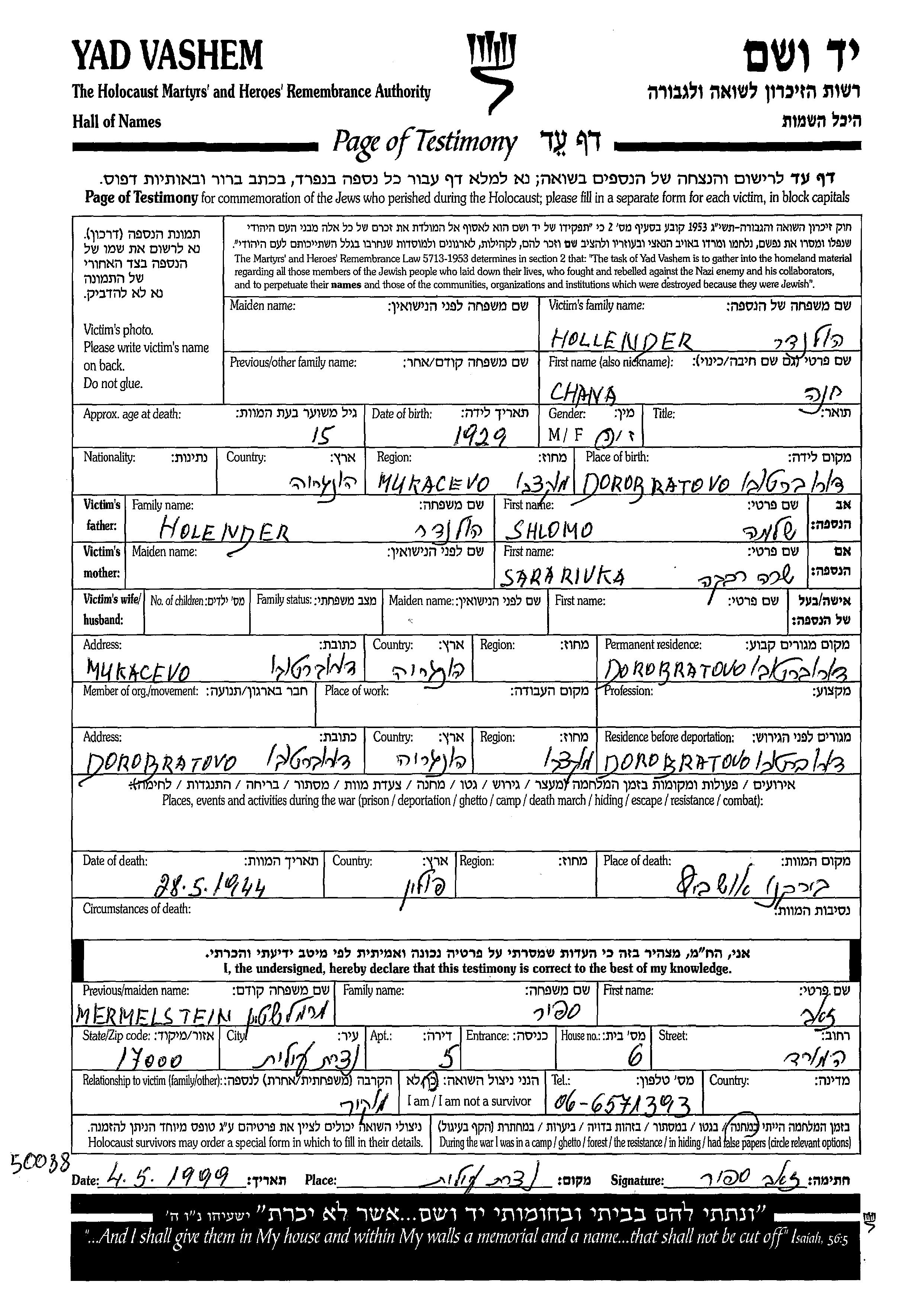 Hollender Chana 1929 Dorobratovo, Tchécoslovaquie Feuille de témoignage