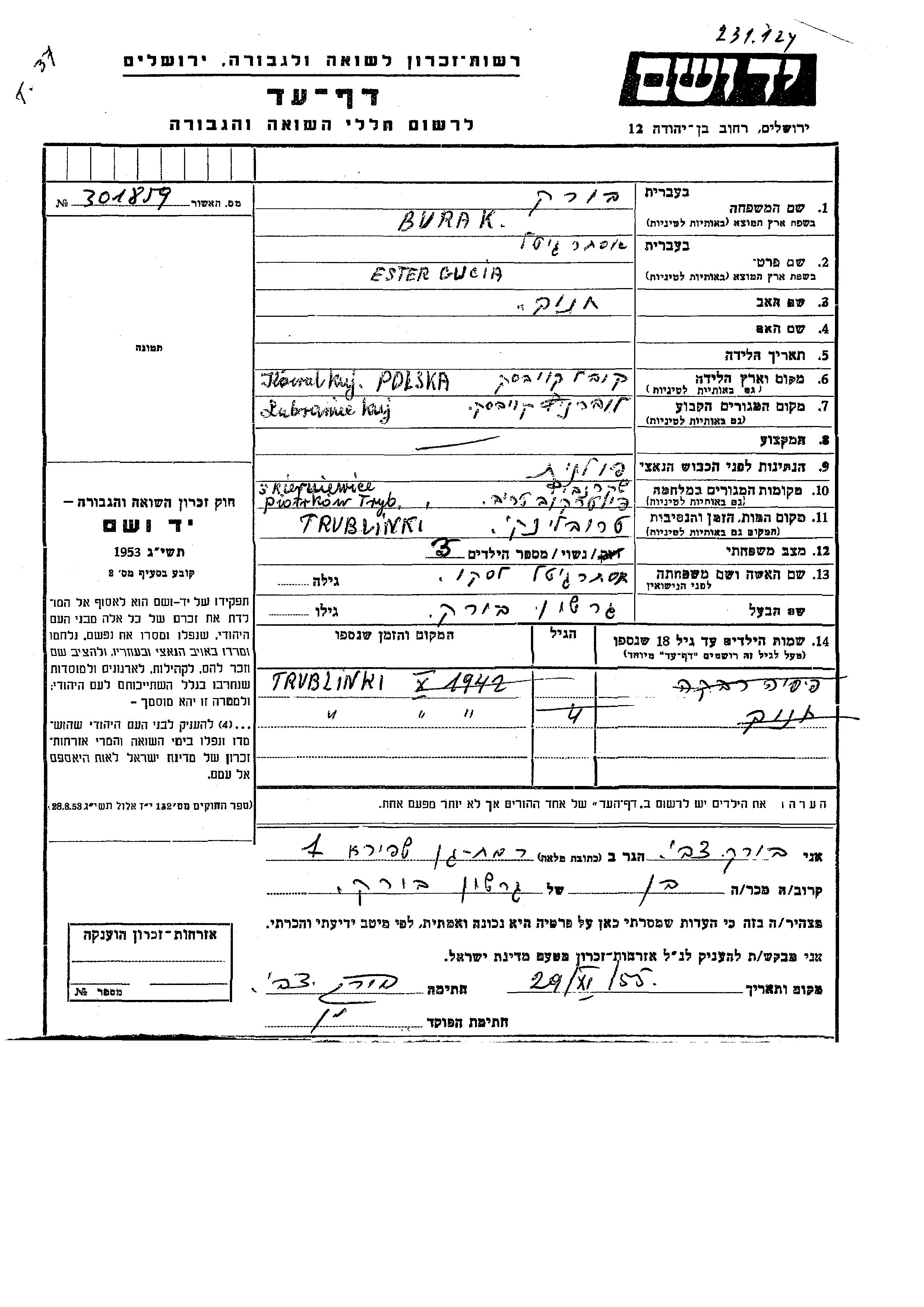 Burak Borek Khanokh Lubranicz, Pologne Feuille de témoignage