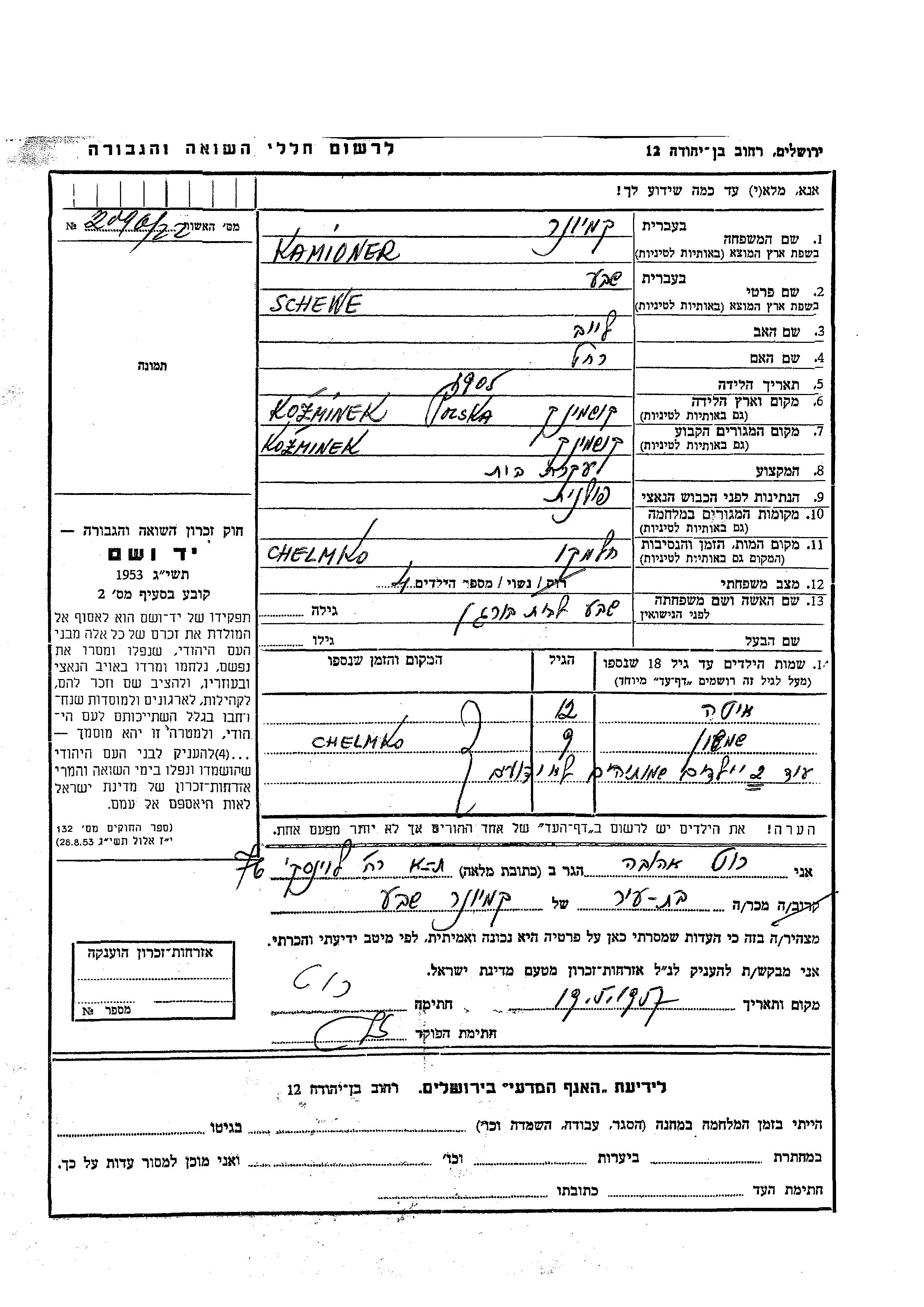 Ita Kamioner est née fille de Schewa née Borgen. Elle était Enfant. Avant la seconde guerre mondiale elle vivait à Kozminek, Pologne.