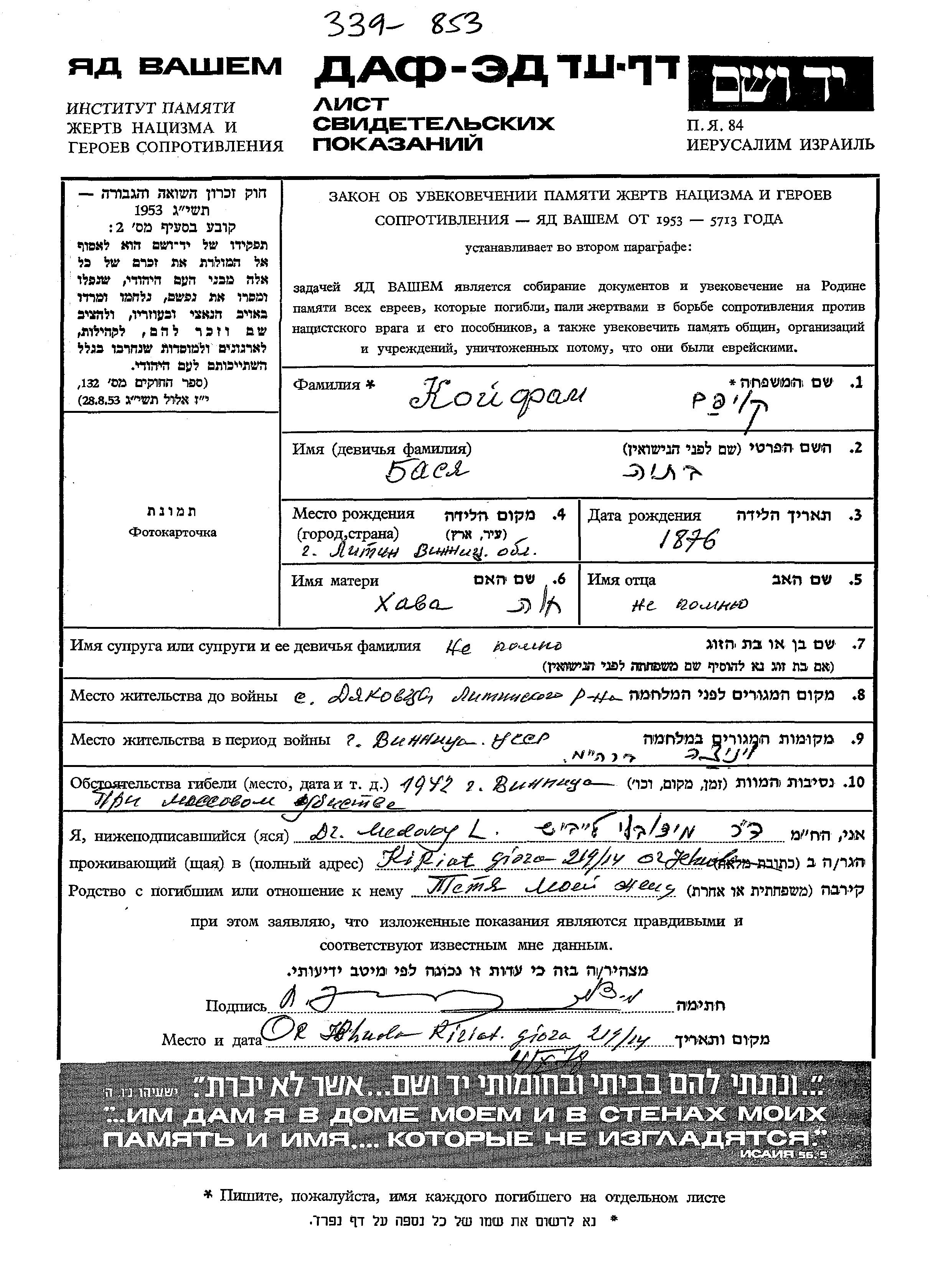 Koifam Basya 1876 Dyakovtsy, Ukraine (URSS) Feuille de témoignage