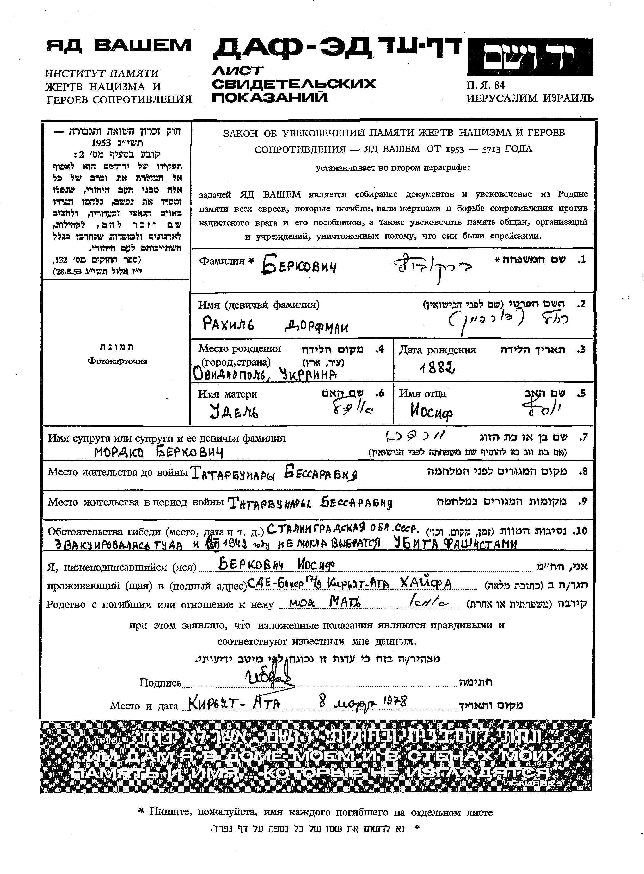 Rakhil Berkovich née Dorfman est née à Ovidiopol, Ukraine (URSS) en 1882, fille de Iosif et de Udel. Elle était Mariée à Mordko. Avant la seconde guerre mondiale elle vivait à Tatarbunary, Roumanie. Pendant la guerre, elle était à Tatarbunary, Roumanie.