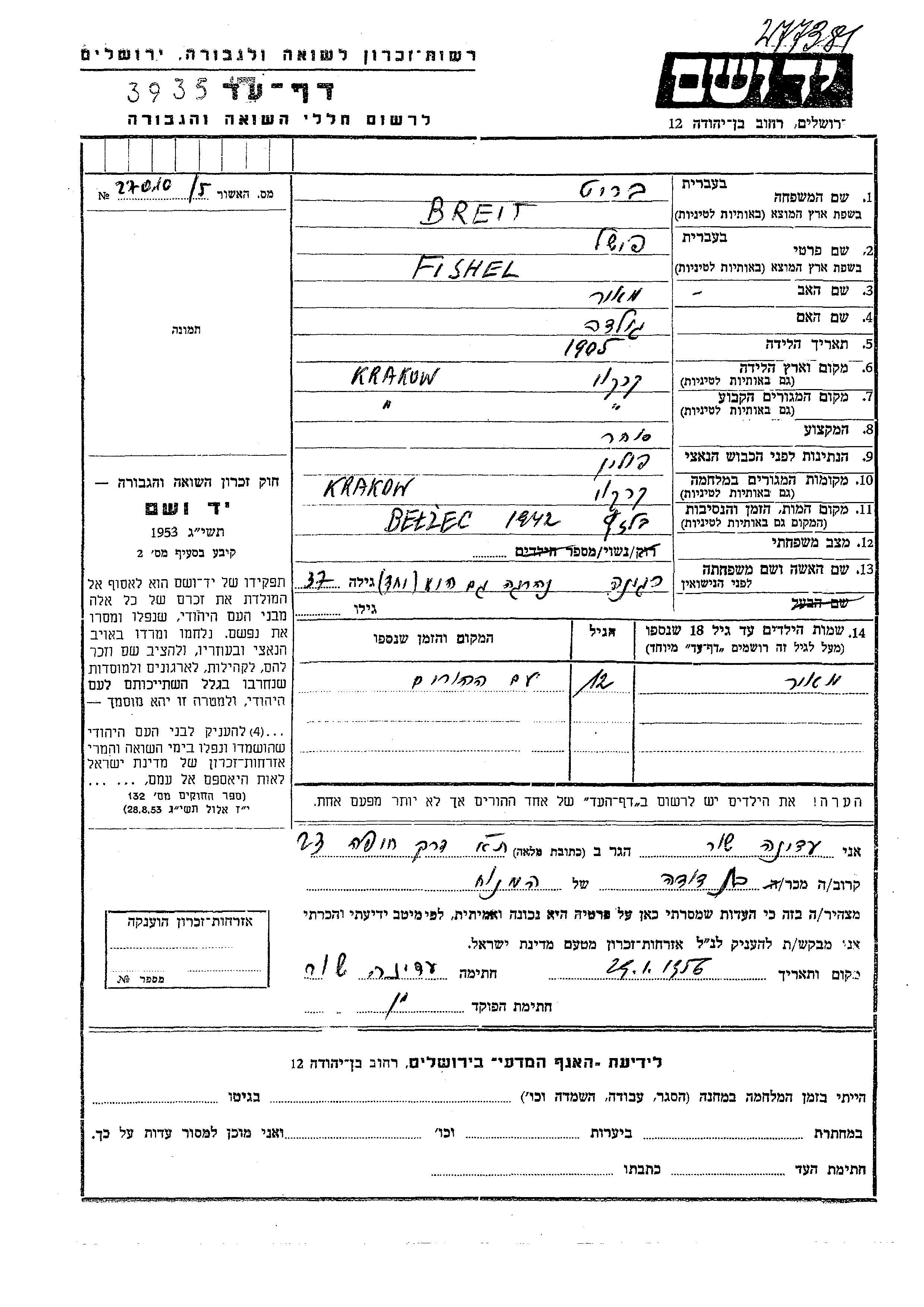 Breit Barit Meir Krakow, Pologne Feuille de témoignage
