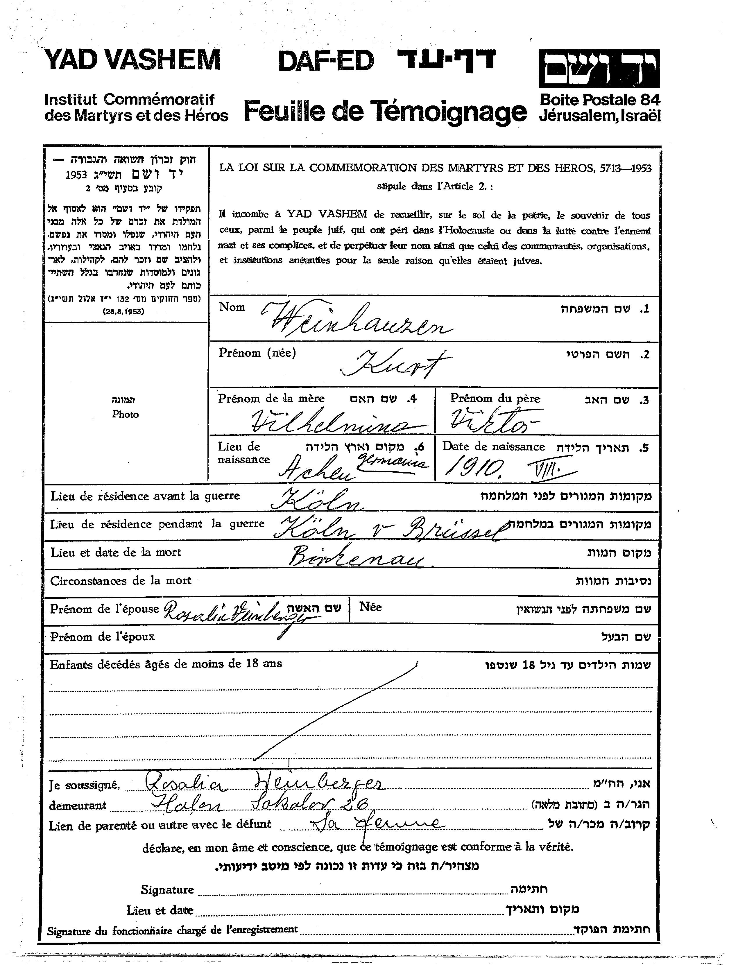 Kurt Weinhauzen est né à Aachen, Allemagne en 1910, fils de Viktor et de Vilhelmina. Il était Mariée à Rosalia née Weinberger. Avant la seconde guerre mondiale il vivait à Koeln, Allemagne. Au cours de la guerre, il était à Brussels, Belgique.