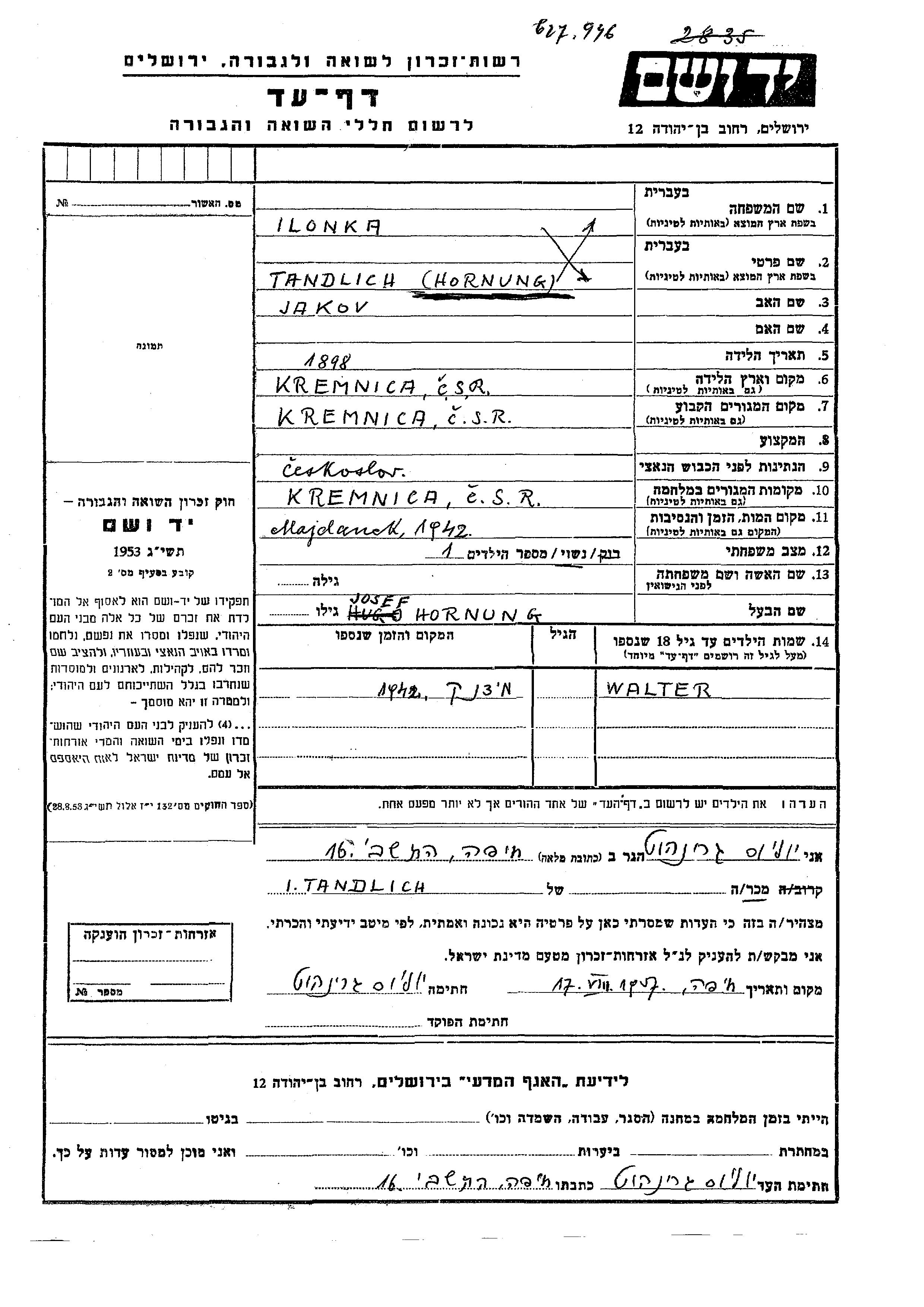 Tandlich Walter Kremnica, Tchécoslovaquie Feuille de témoignage
