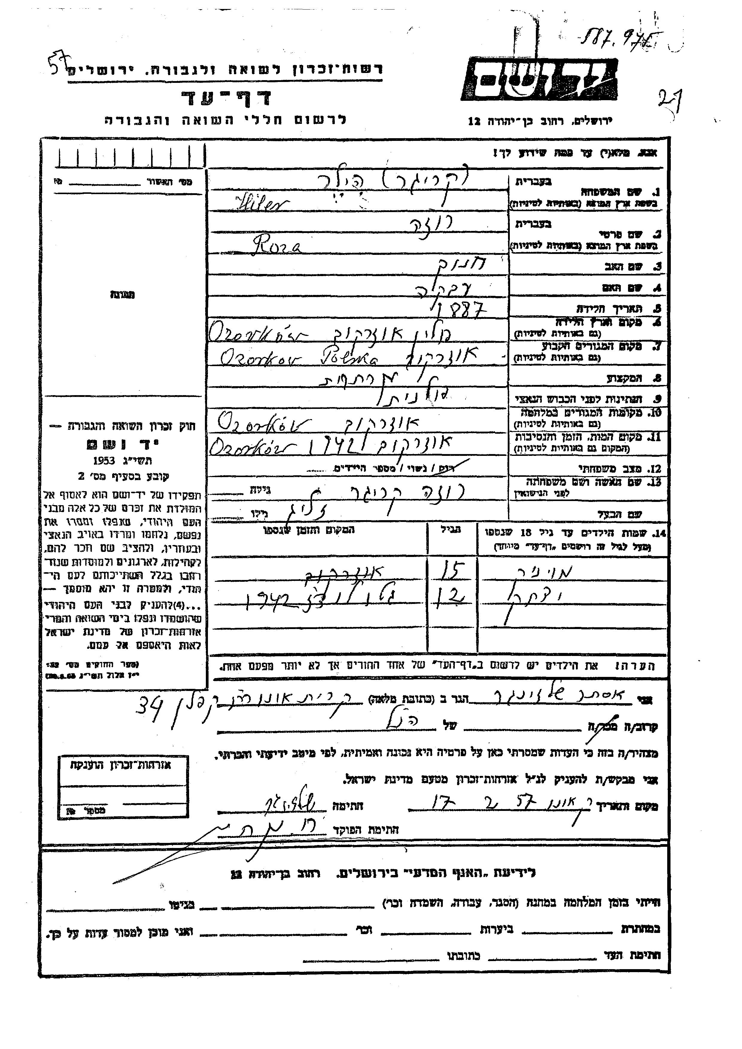 Hiler Monik Ozorkow, Pologne Feuille de témoignage