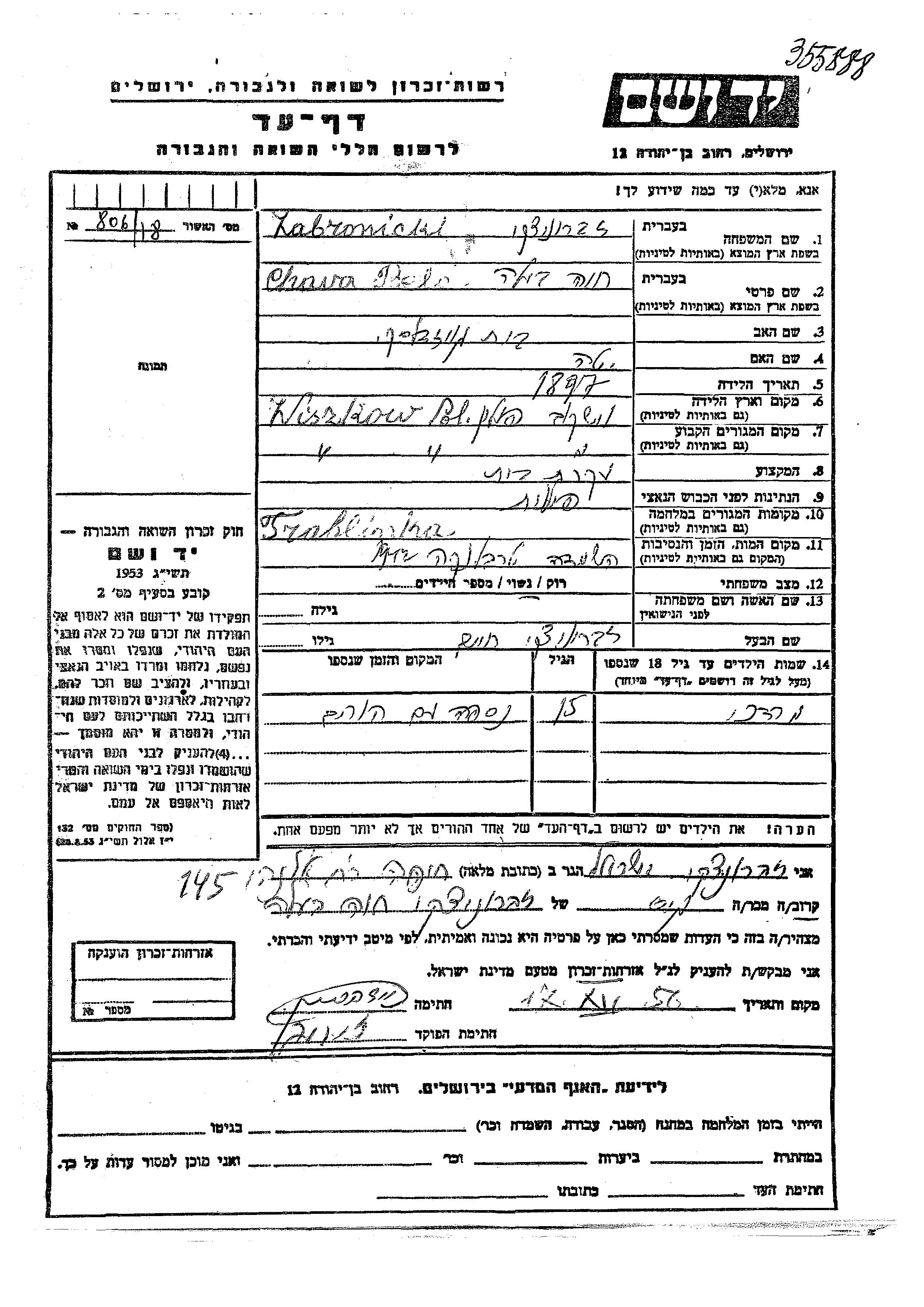 Mordekhai Zabronicki est né fils de Khaim et de Chava Bila née Zabronitzki. Il était Enfant. Avant la seconde guerre mondiale il vivait à Wiszkow, Pologne. Au cours de la guerre, il était à Treblinka, Pologne.