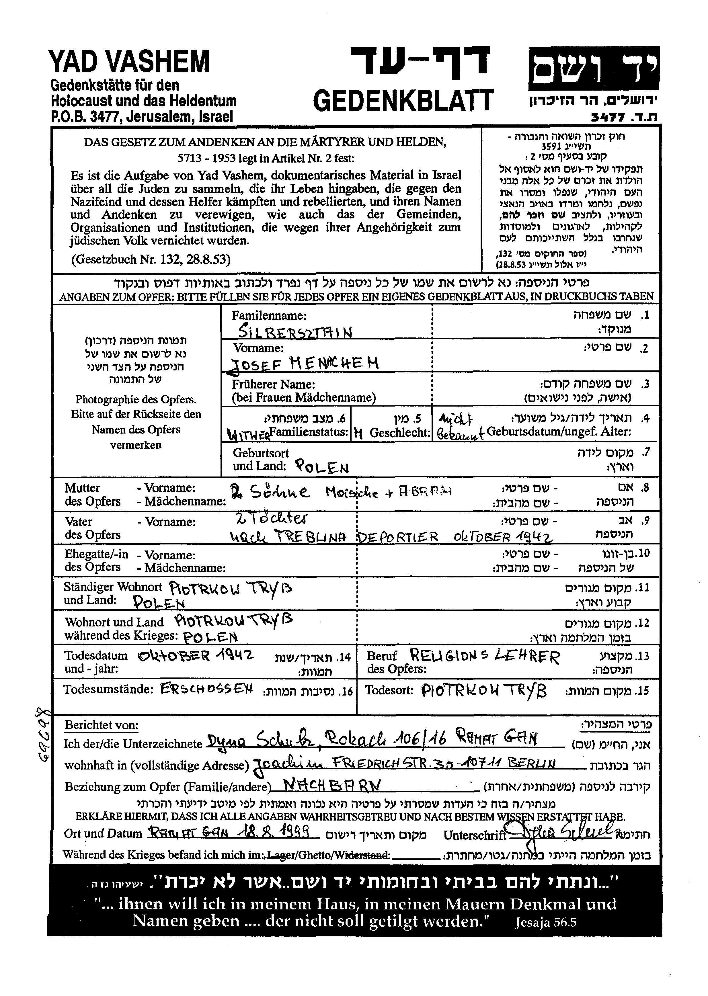 Silbersztain Moische Piotrkow Trybunalski, Pologne Feuille de témoignage