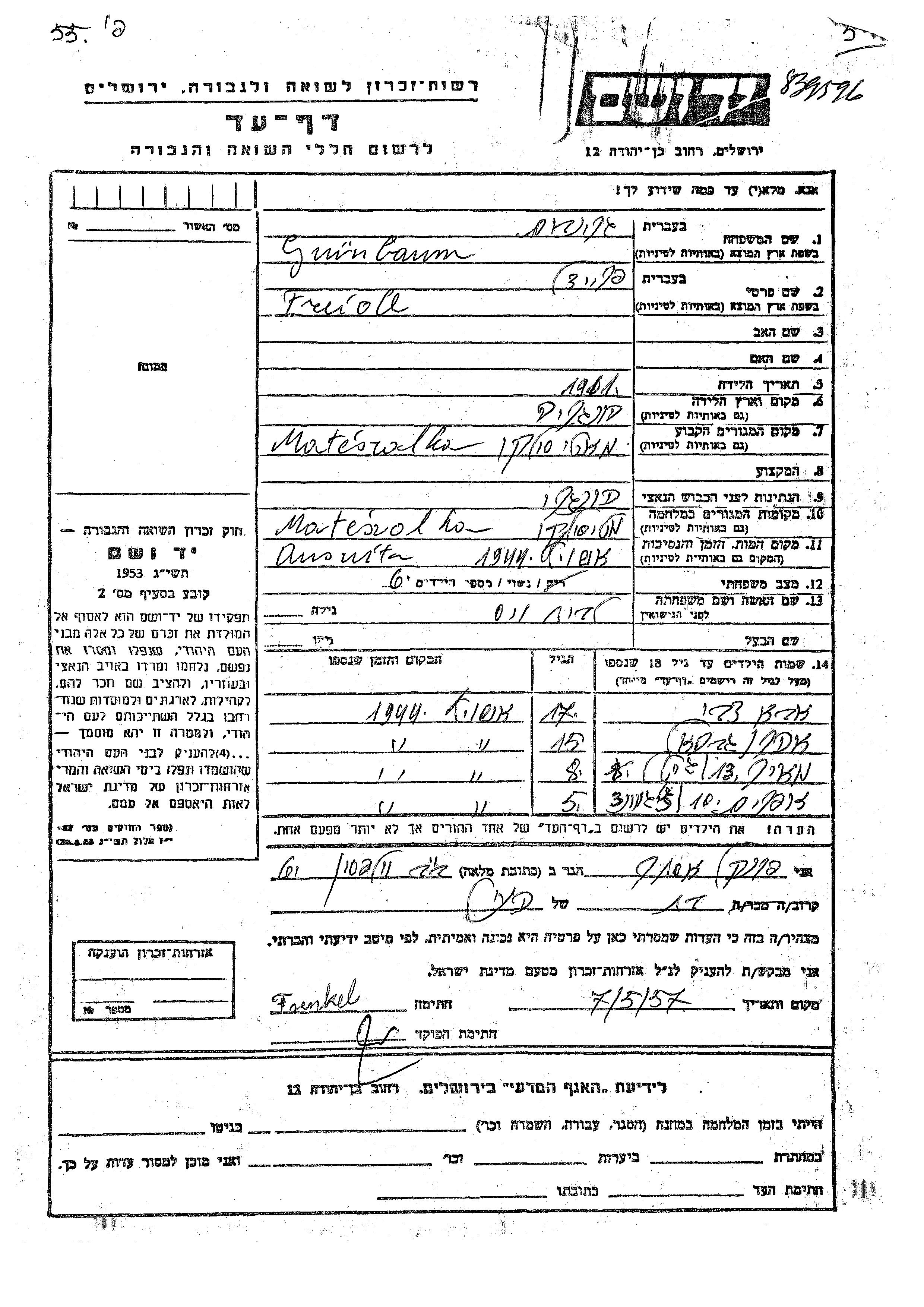 Yad Vashem - Pages of Testimony Names Memorial Collection