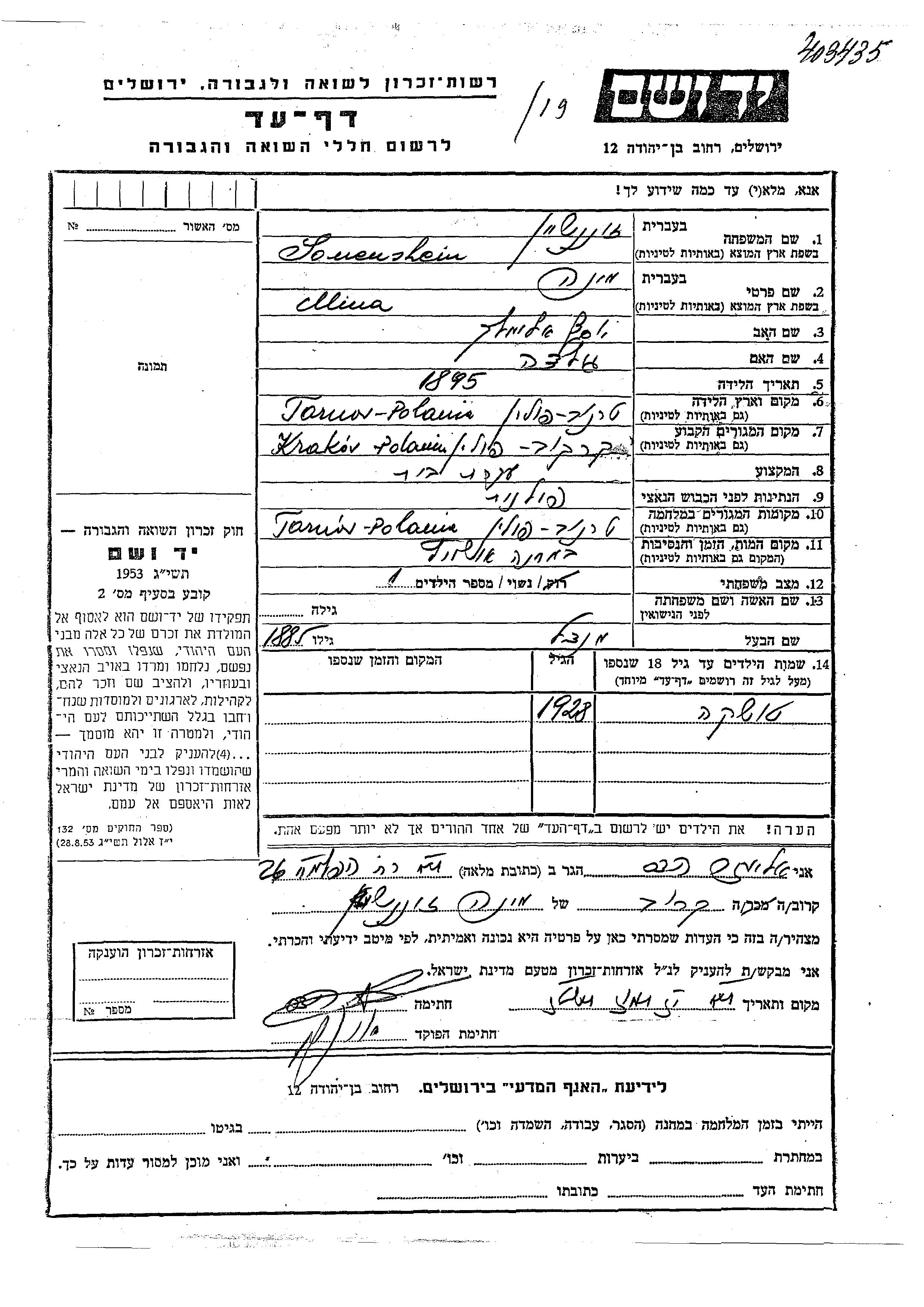 Sonenshein Toshka 1928 Krakow, Pologne Feuille de témoignage