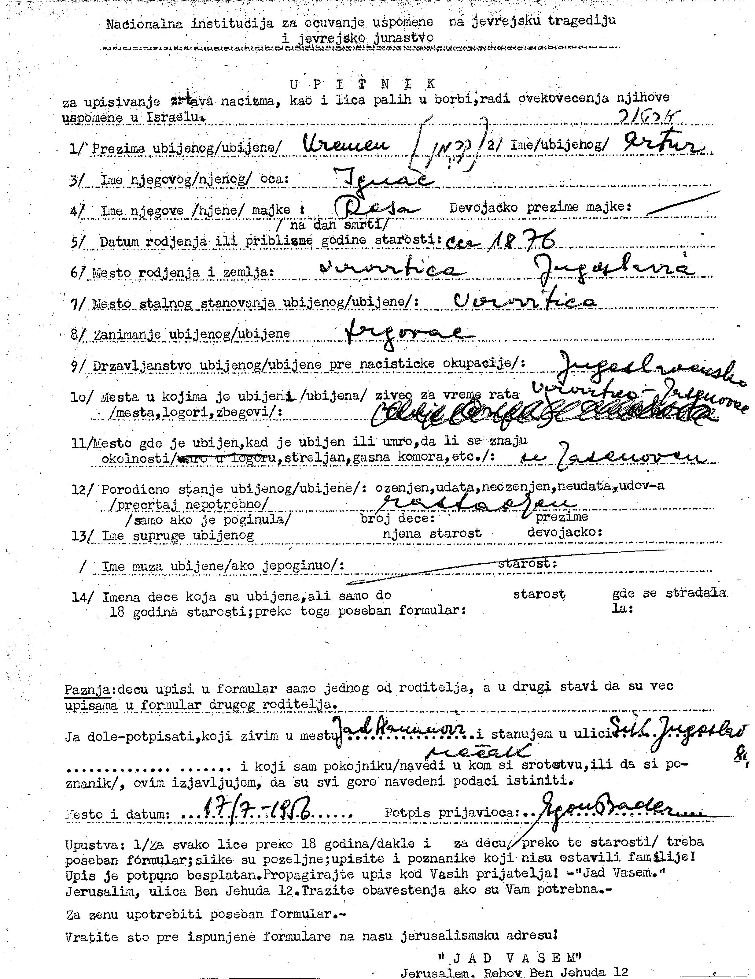 Artur a été assassiné pendant la Shoah. Lieu de la mort: Jasenovac, Yugoslavie.