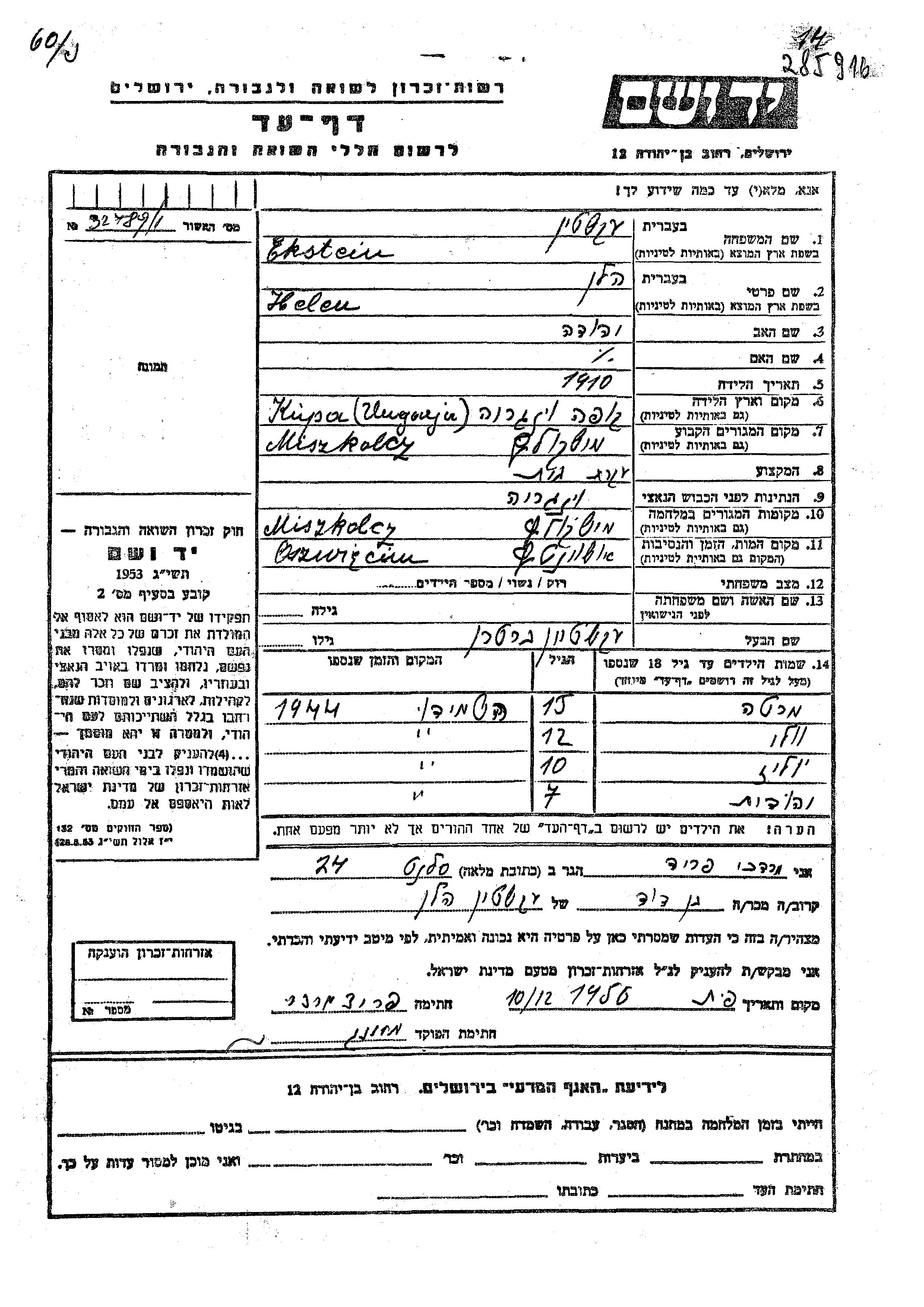 Ekstein Marta Miskolcz, Hongrie Feuille de témoignage
