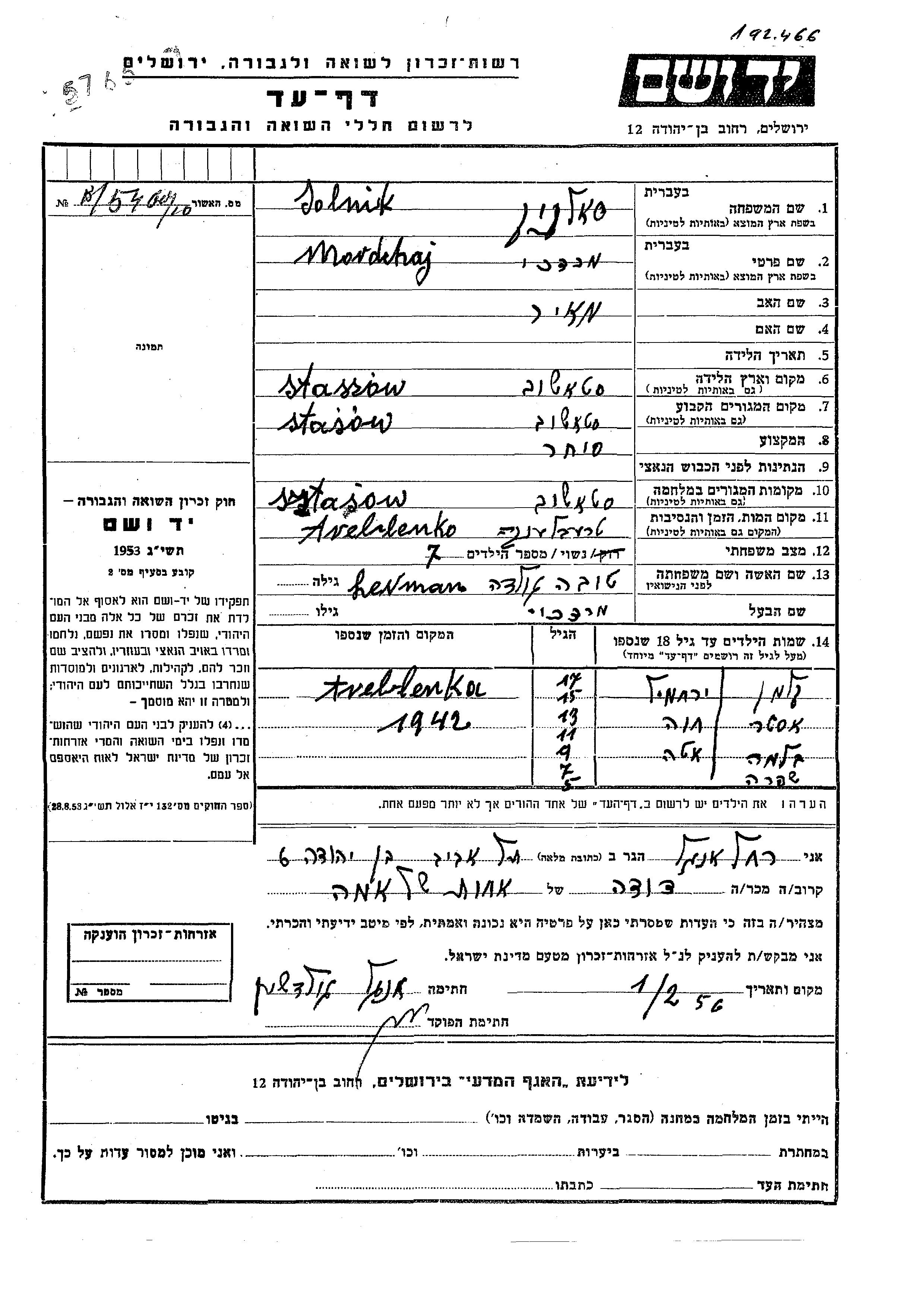 Yerakhmiel Salnik Solnik est né fils de Mordehaj et de Tova Golda née Herman. Il était Enfant. Avant la seconde guerre mondiale il vivait à Staszow, Pologne. Au cours de la guerre, il était à Staszow, Pologne.