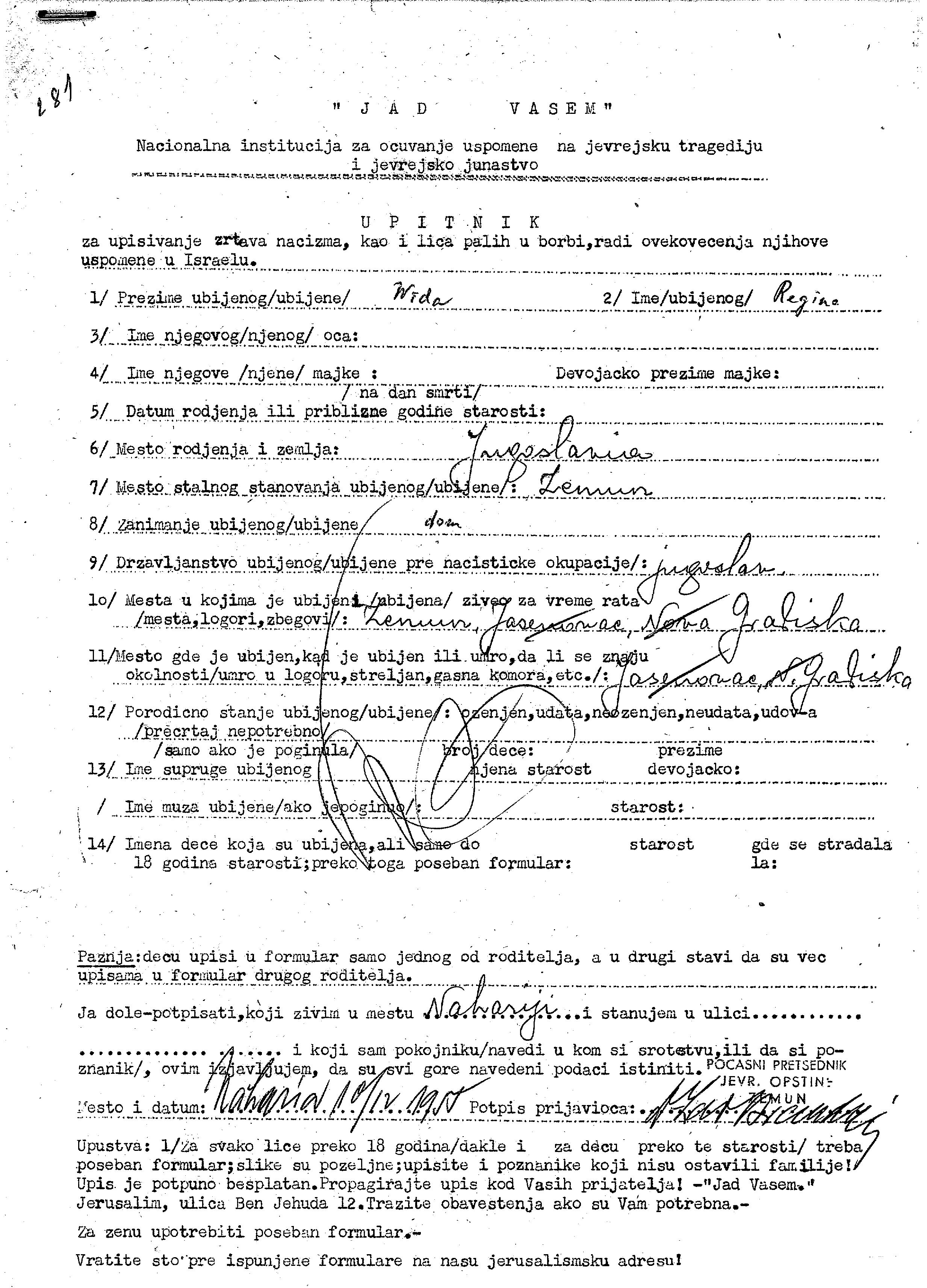 Wida Regina Zemun, Yugoslavie Feuille de témoignage