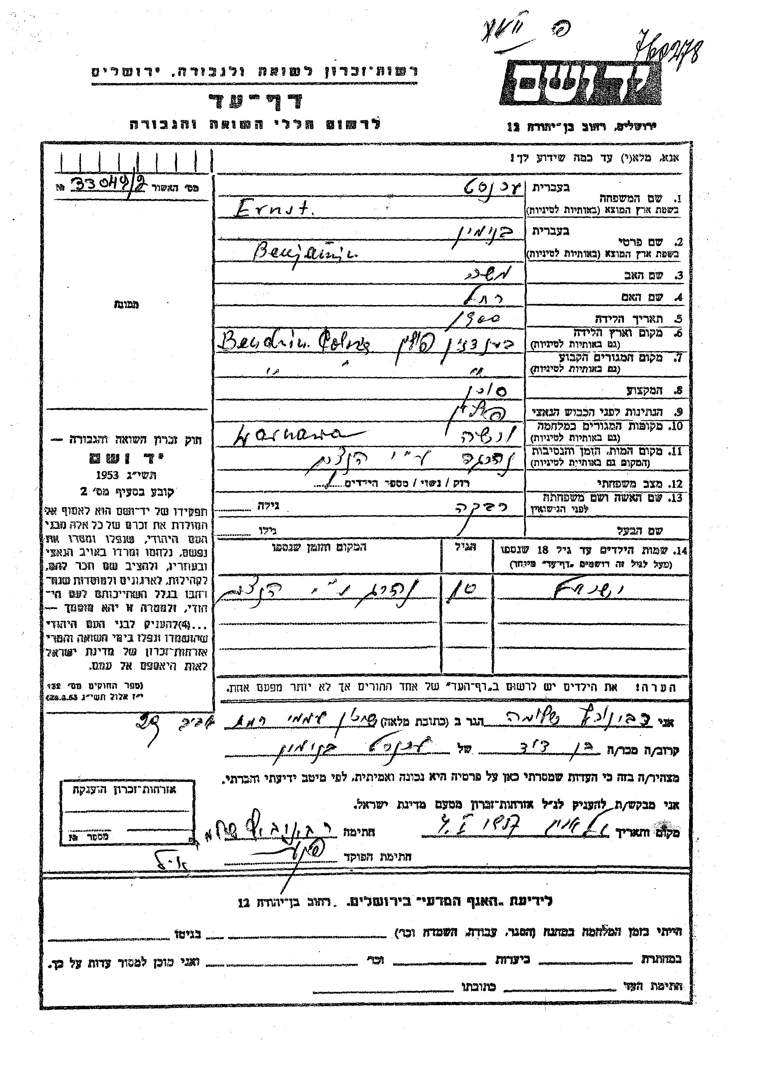 Yisrael Ernst est né fils de Benjamin et de Rivka. Il était Enfant. Avant la seconde guerre mondiale il vivait à Bendzin, Pologne. Au cours de la guerre, il était à Warsaw, Pologne.