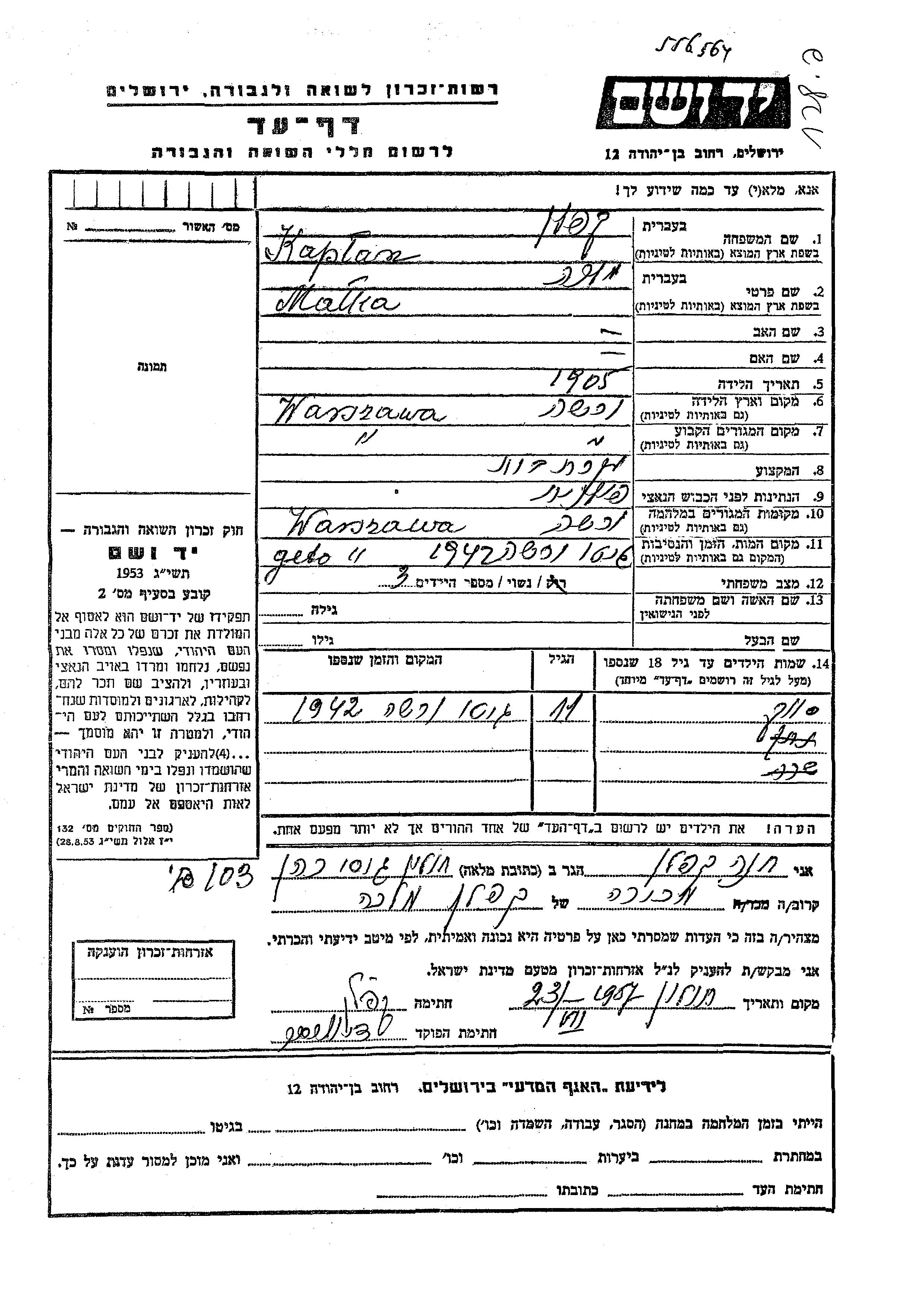 Kaplan Severen Warsaw, Pologne Feuille de témoignage