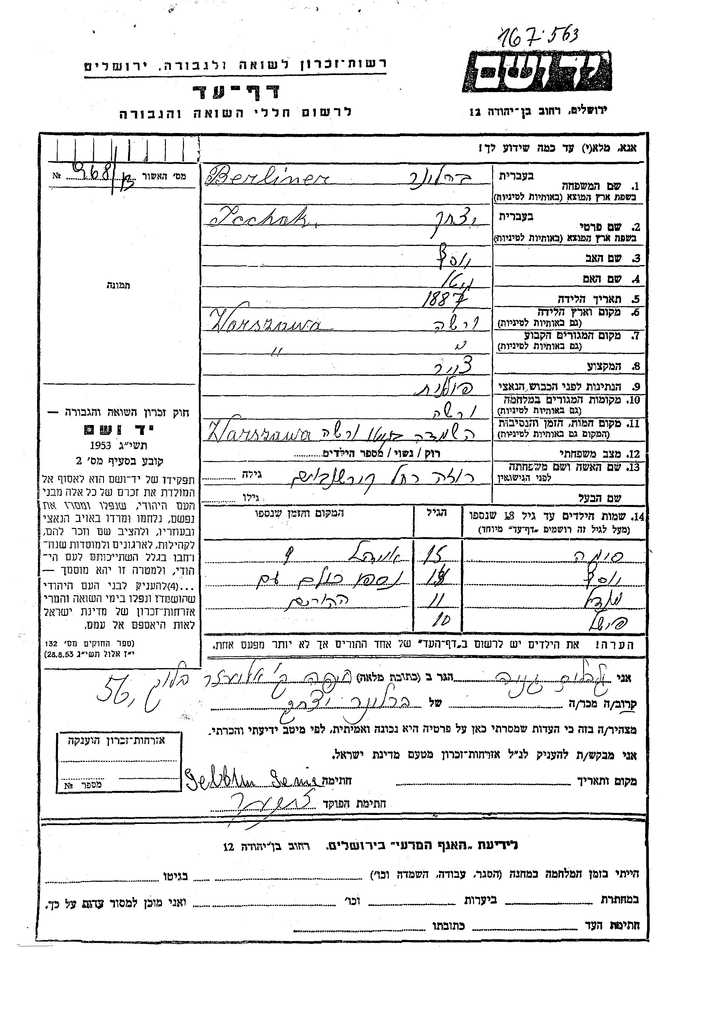 Berliner Fishel Warszawa, Pologne Feuille de témoignage