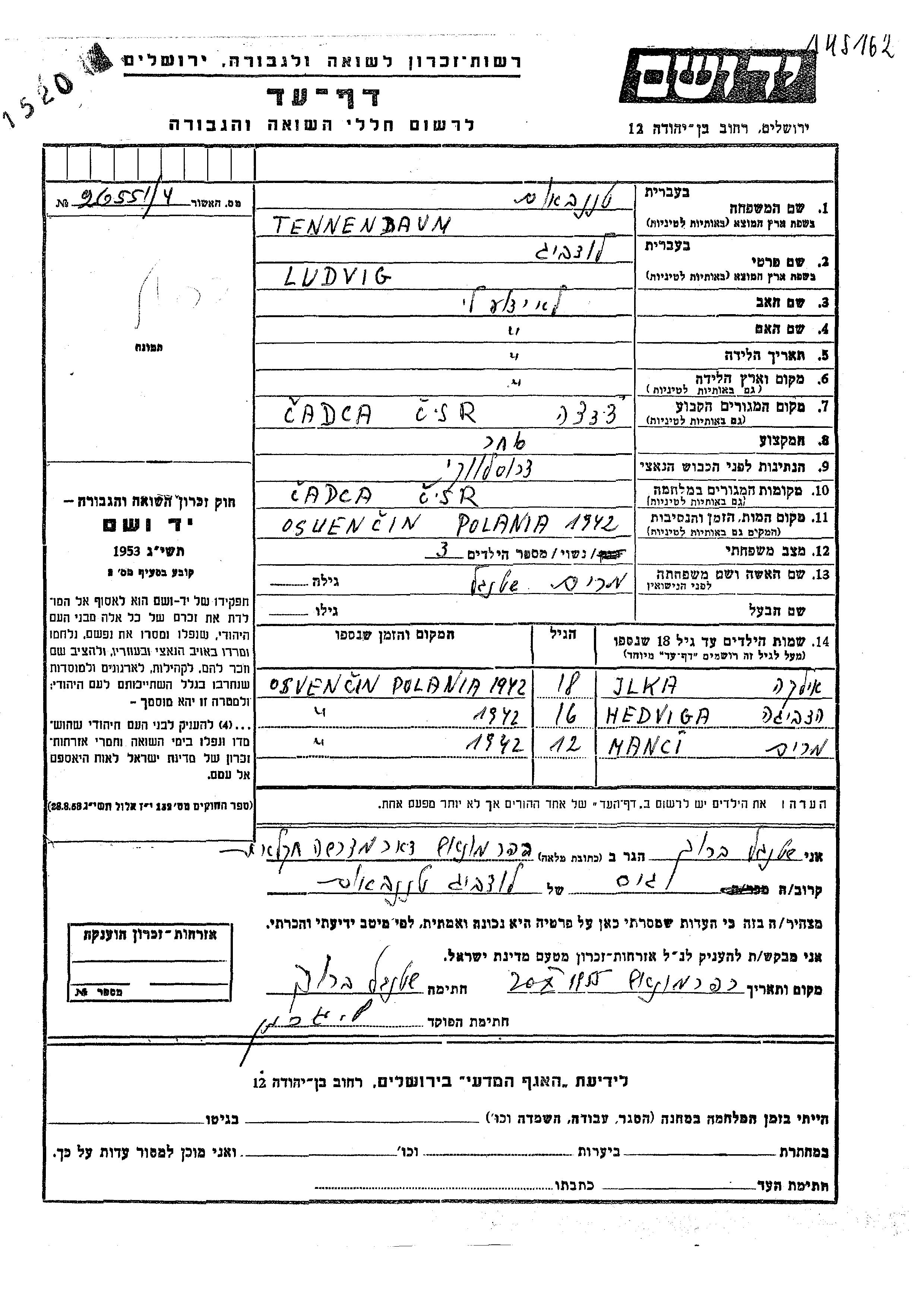 Tennenbaum Jlka Cadca, Tchécoslovaquie Feuille de témoignage