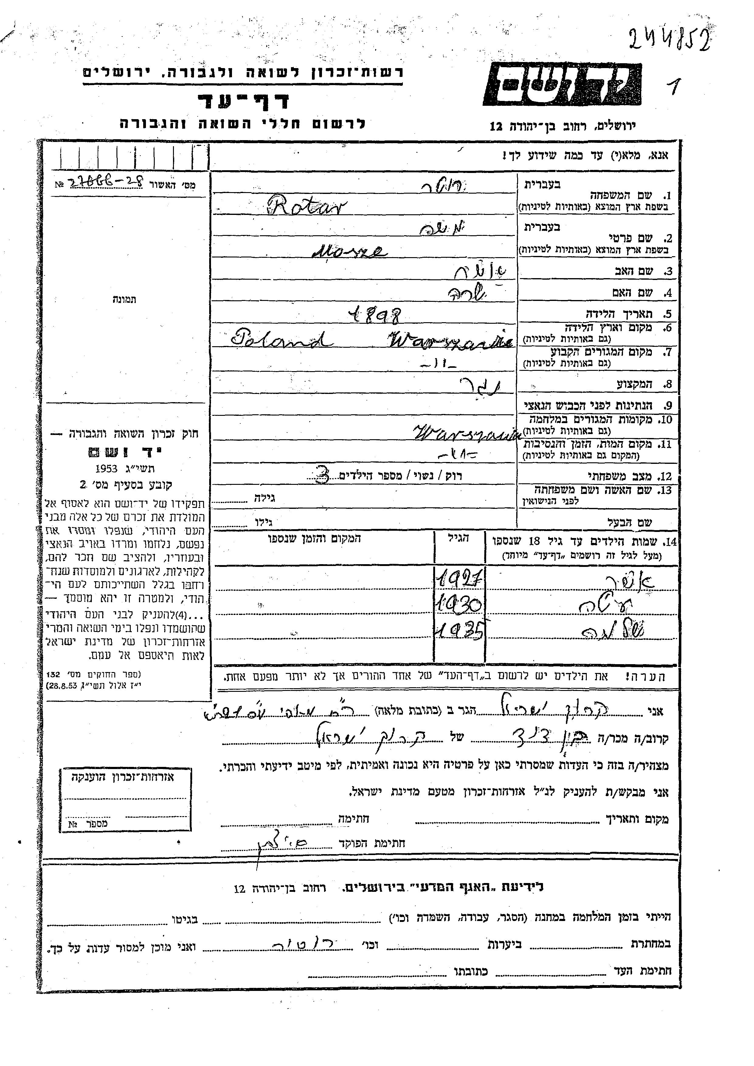 Rotar Shlomo Warsaw, Pologne Feuille de témoignage