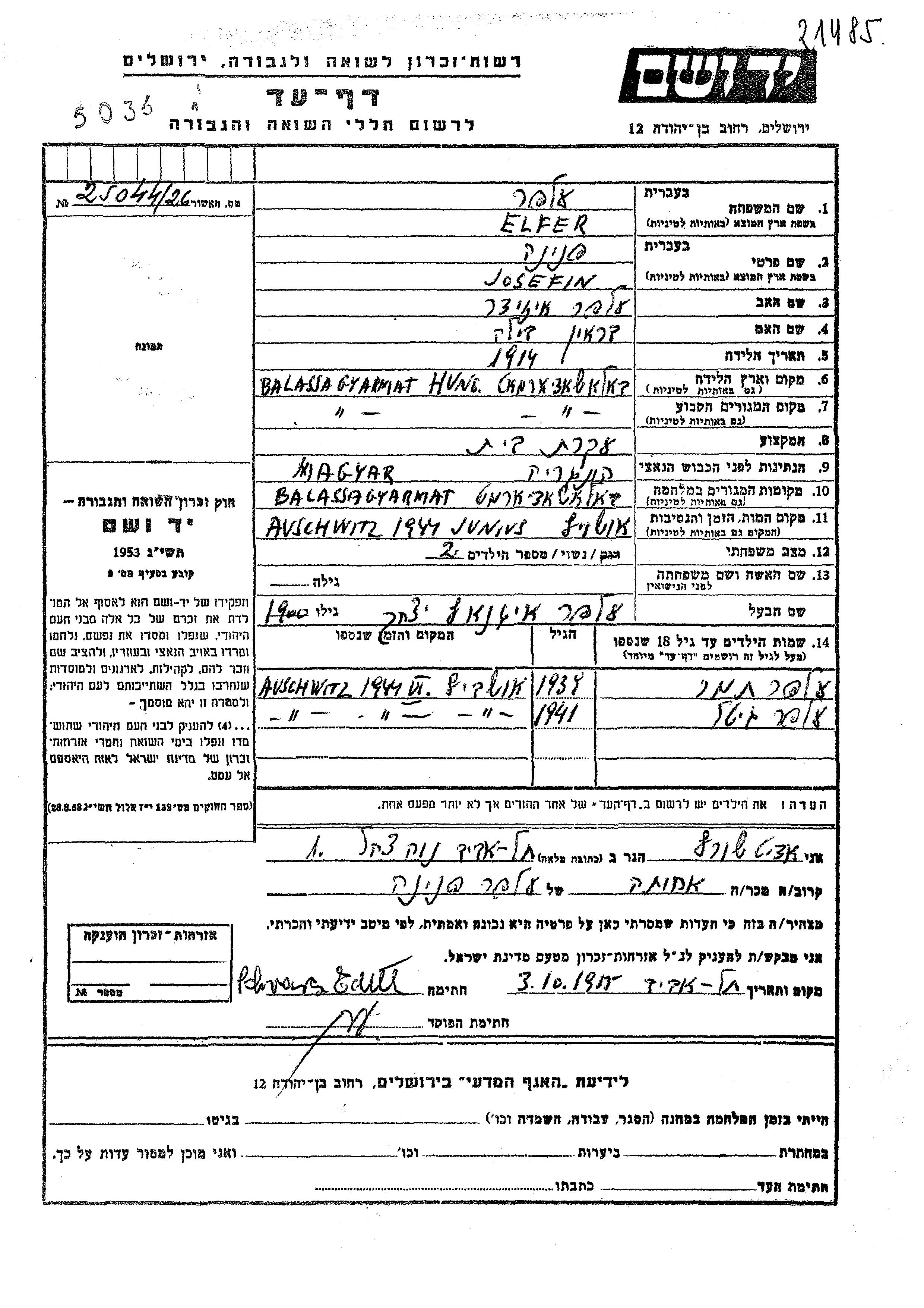 Elfer Gitel Balassagyarmat, Hongrie Feuille de témoignage