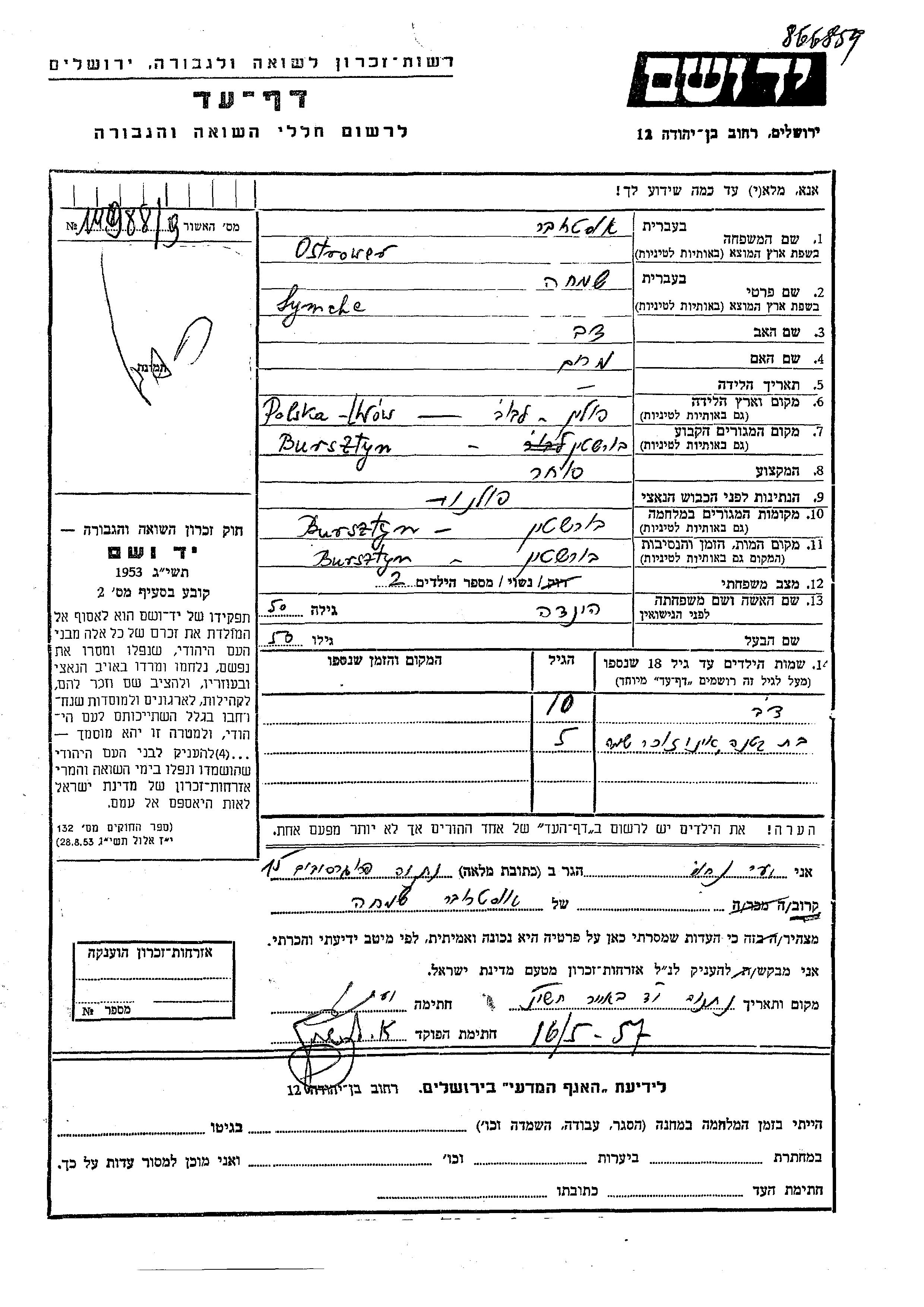 Ostrower prénom inconnu Bursztyn, Pologne Feuille de témoignage