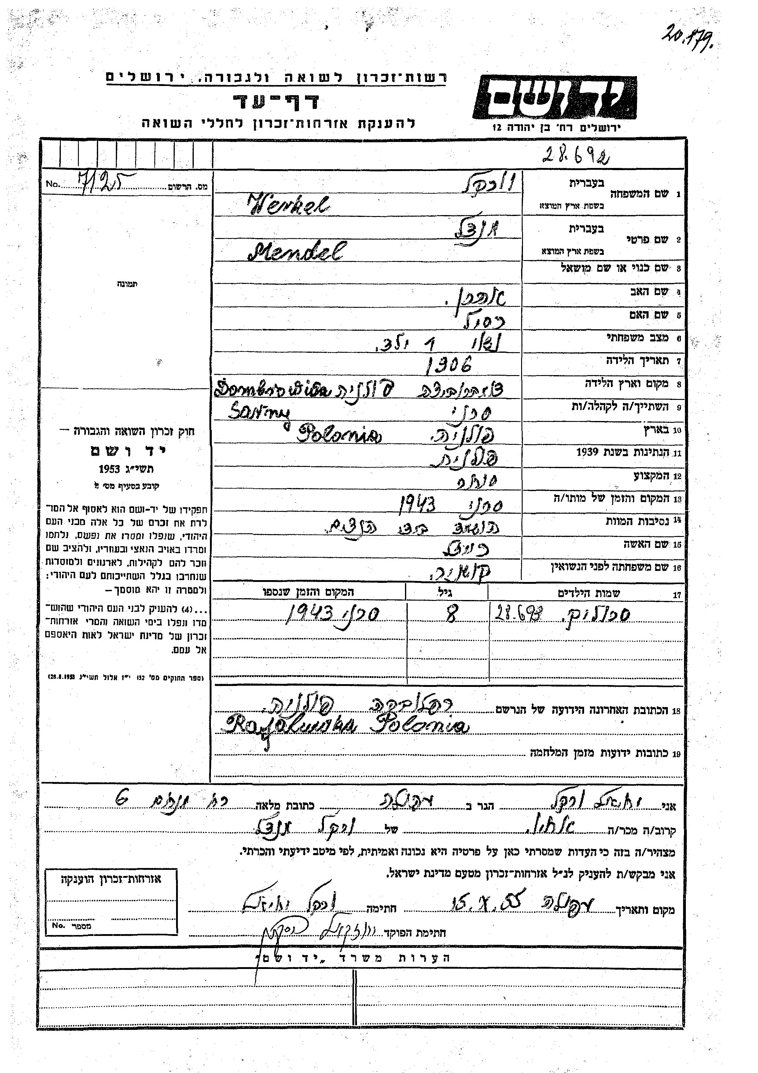 Werkel Yisrael Sarny, Pologne Feuille de témoignage