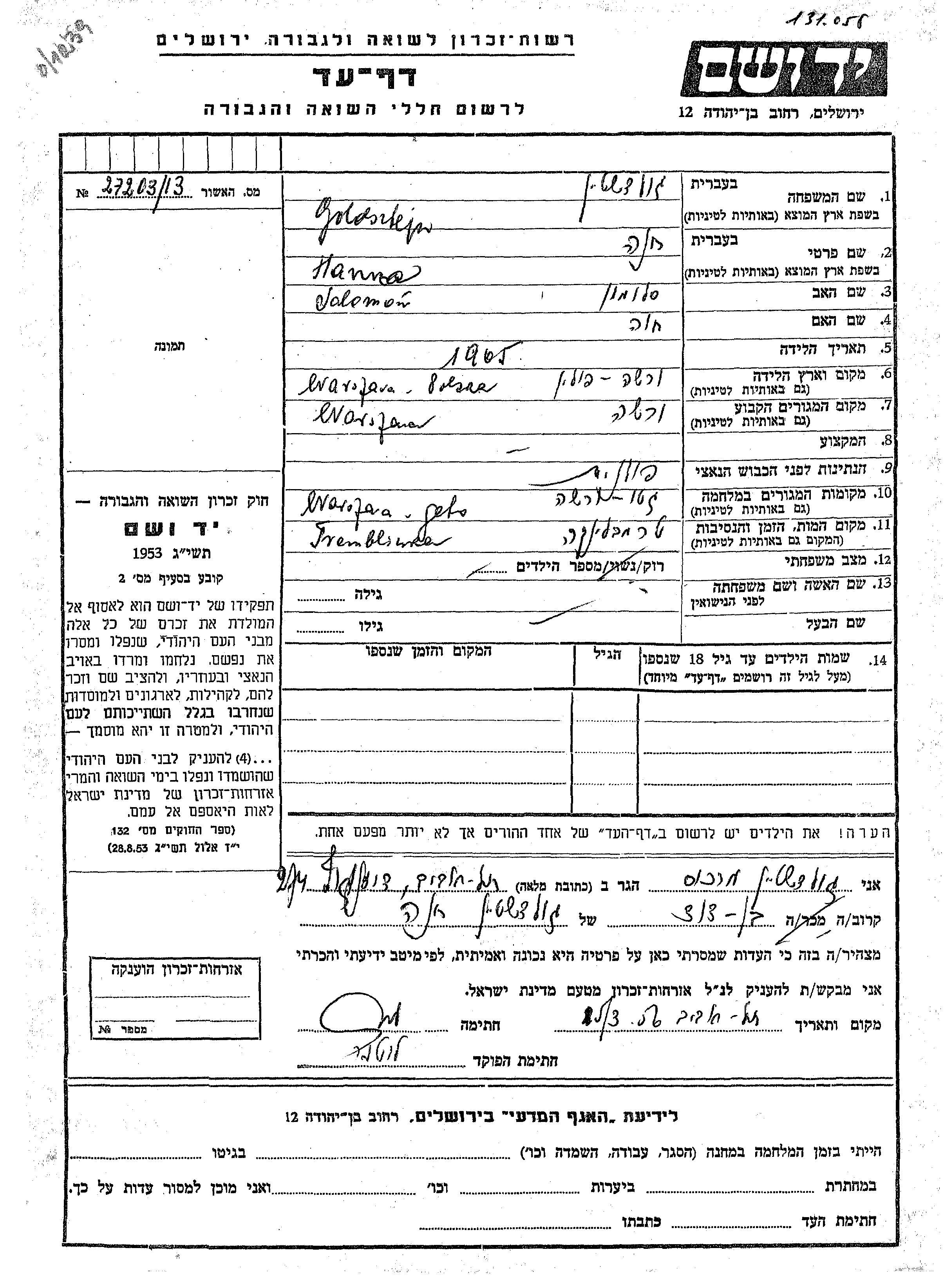 Goldstein Hanna 1905 Warsaw, Pologne Feuille de témoignage