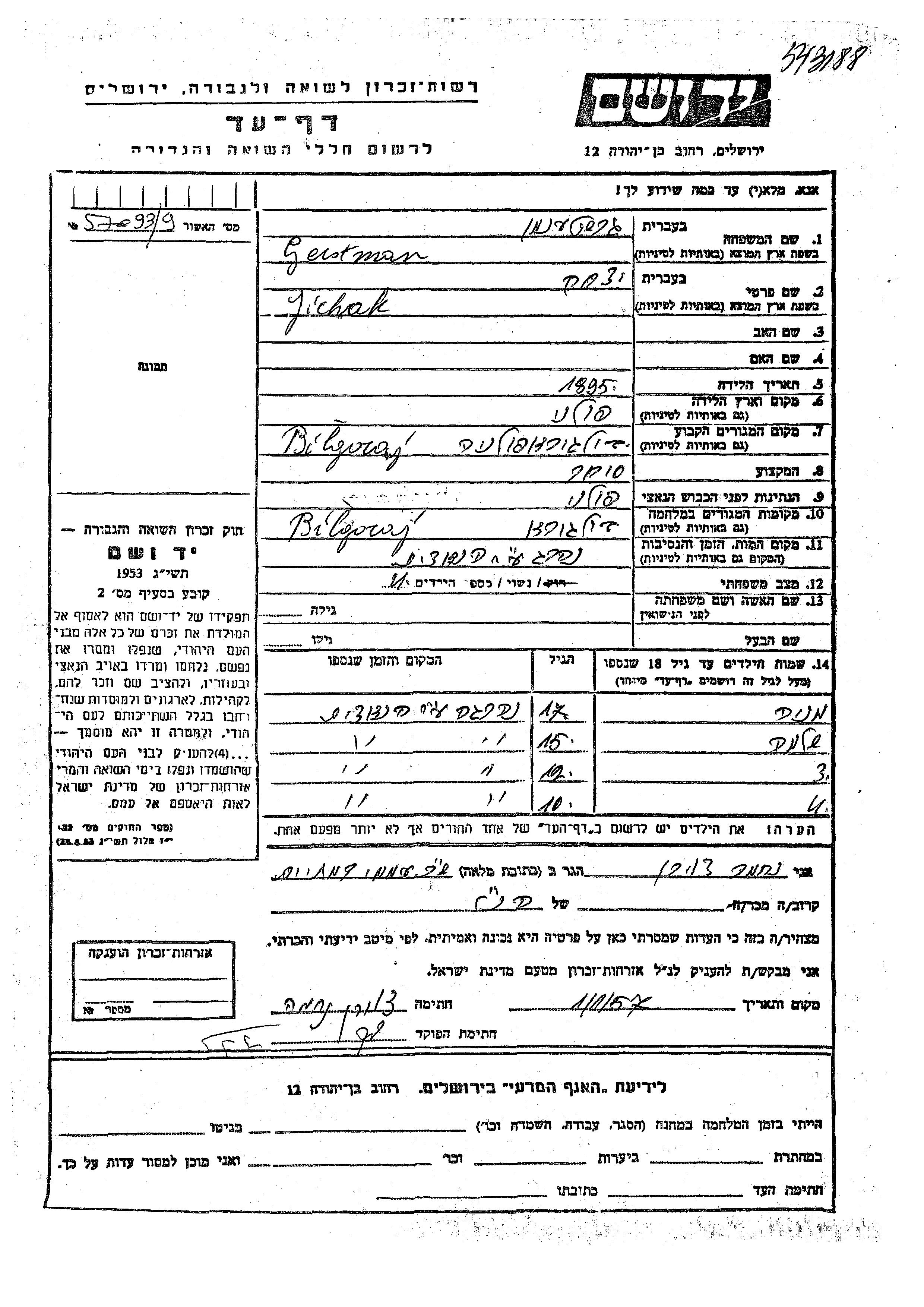 Gershtenman Gerstman prénom inconnu endroit inconnu, Feuille de témoignage