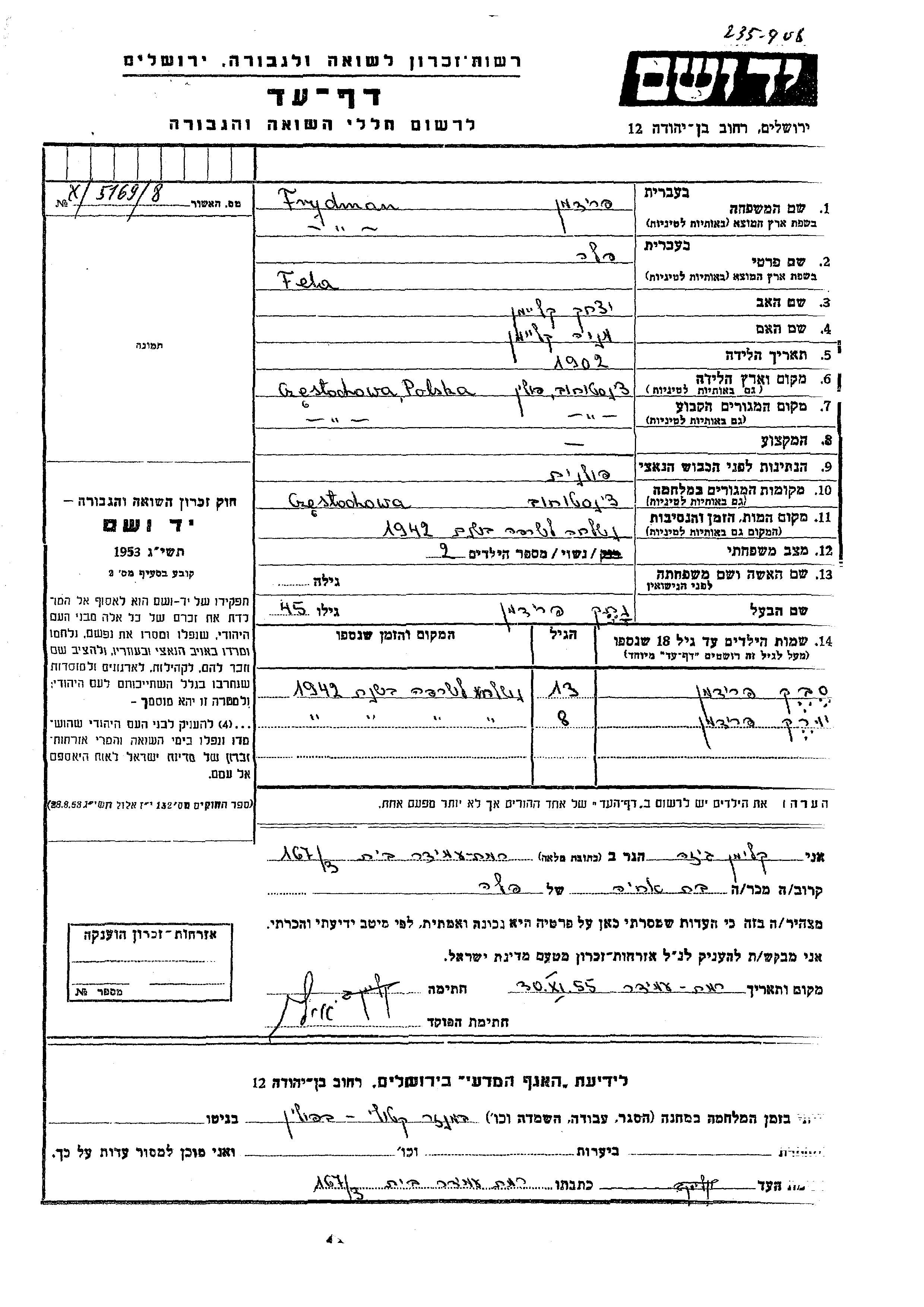 Frydman Sevek Czestochow, Pologne Feuille de témoignage