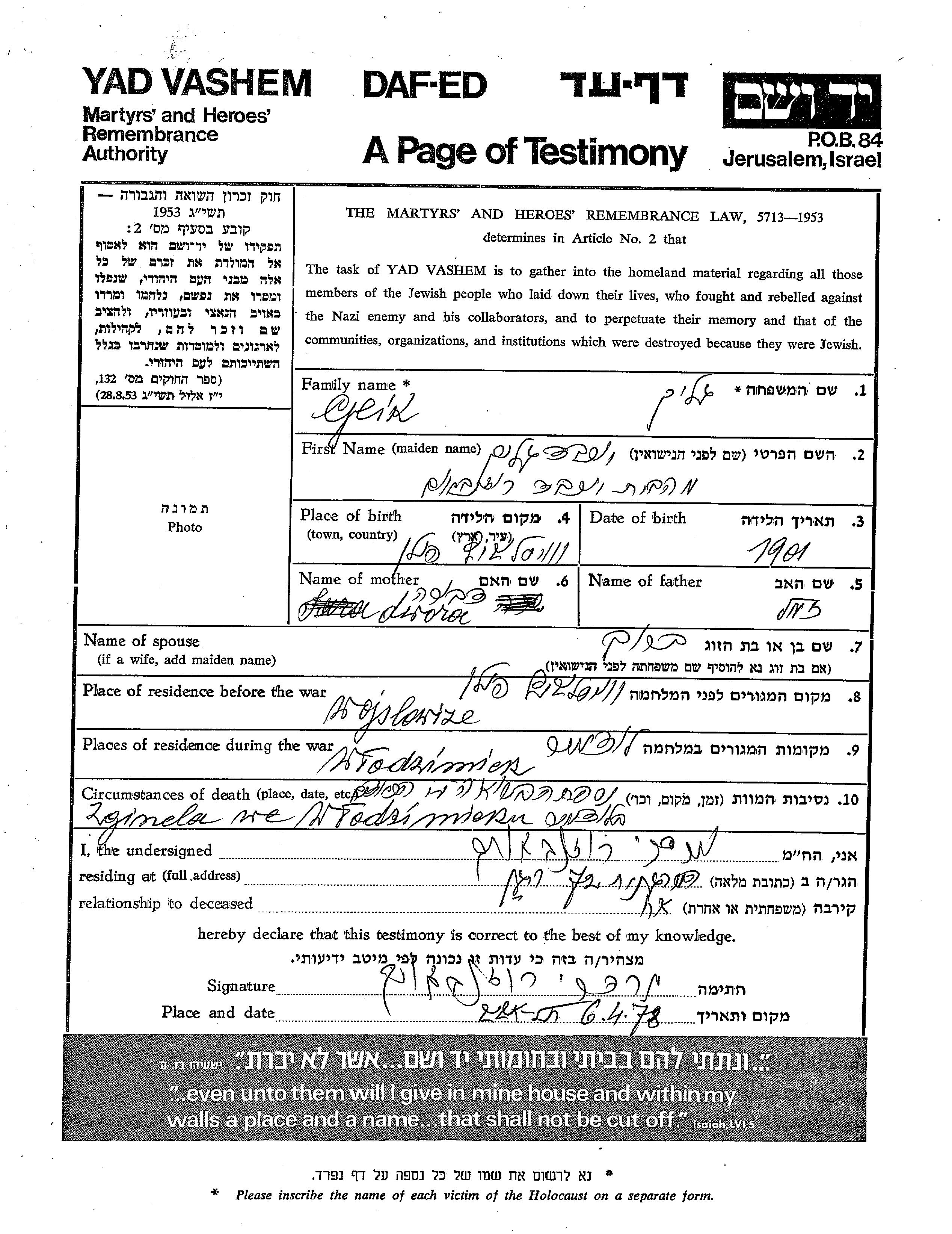 Yad Vashem - Pages of Testimony Names Memorial Collection