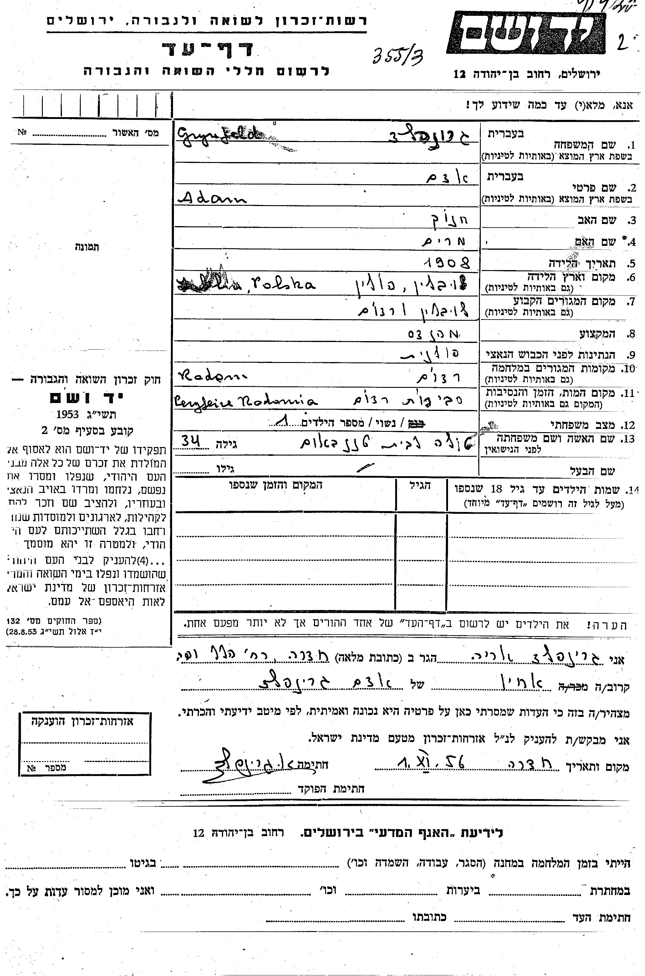 Grynfeld Adam 1908 Radom, Pologne Feuille de témoignage