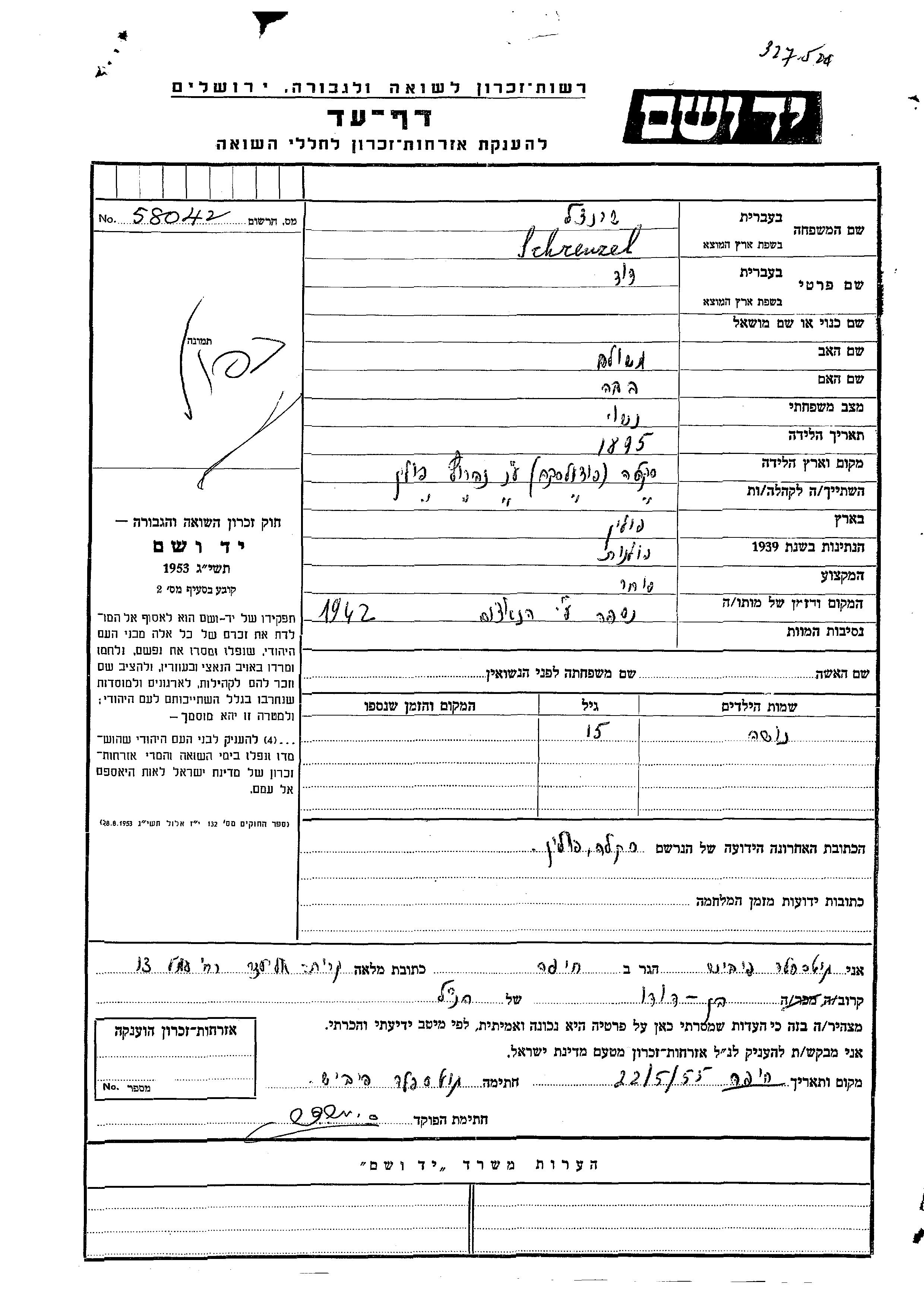 Schrenzel Nusha endroit inconnu, Feuille de témoignage