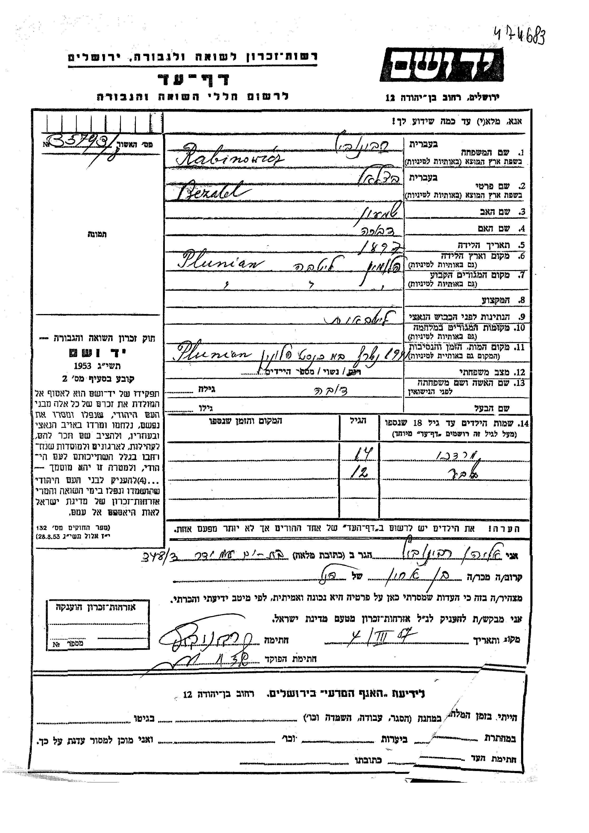 Yad Vashem - Pages of Testimony Names Memorial Collection
