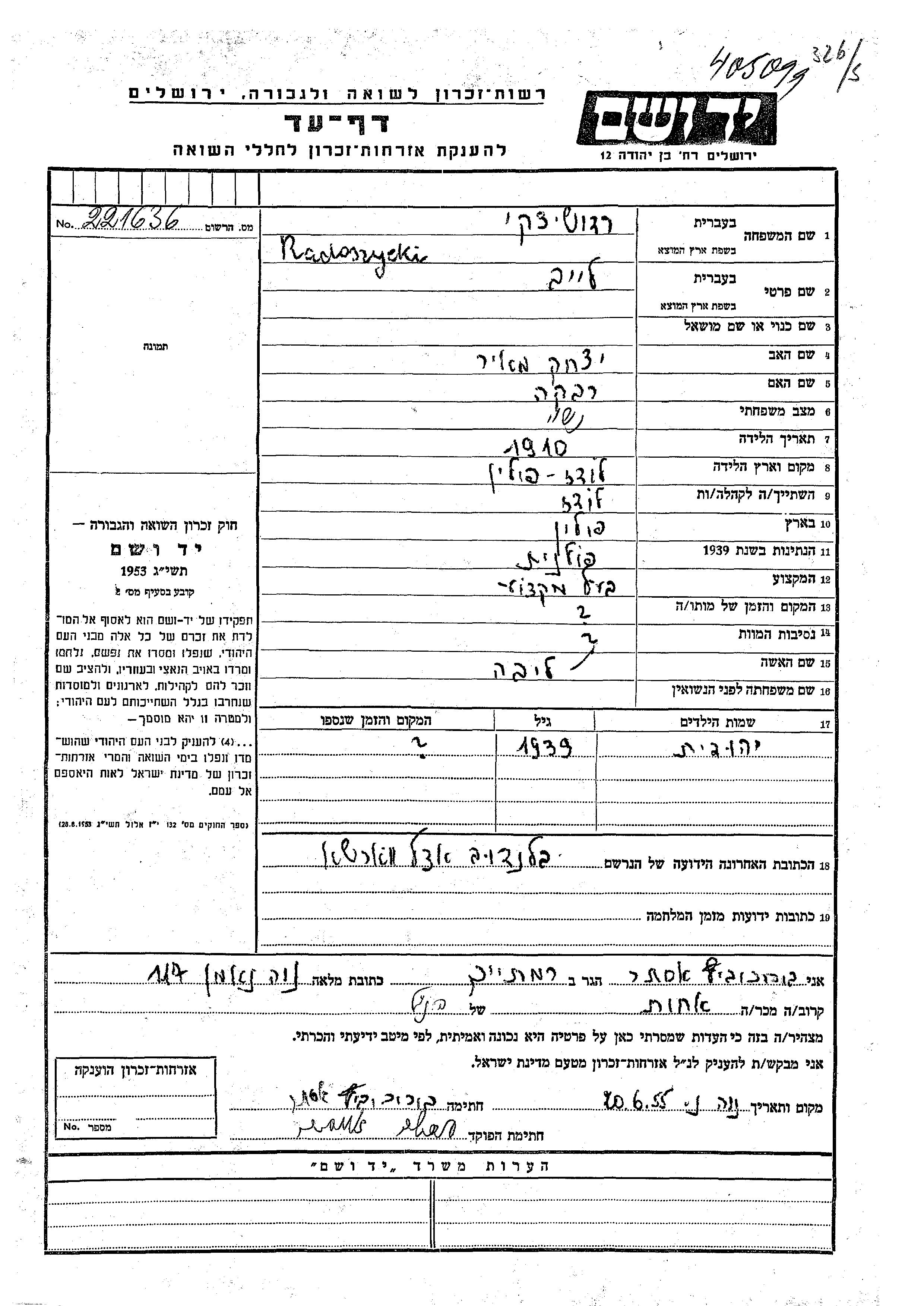 Radoszycki Yehudit 1939 Lodz, Pologne Feuille de témoignage