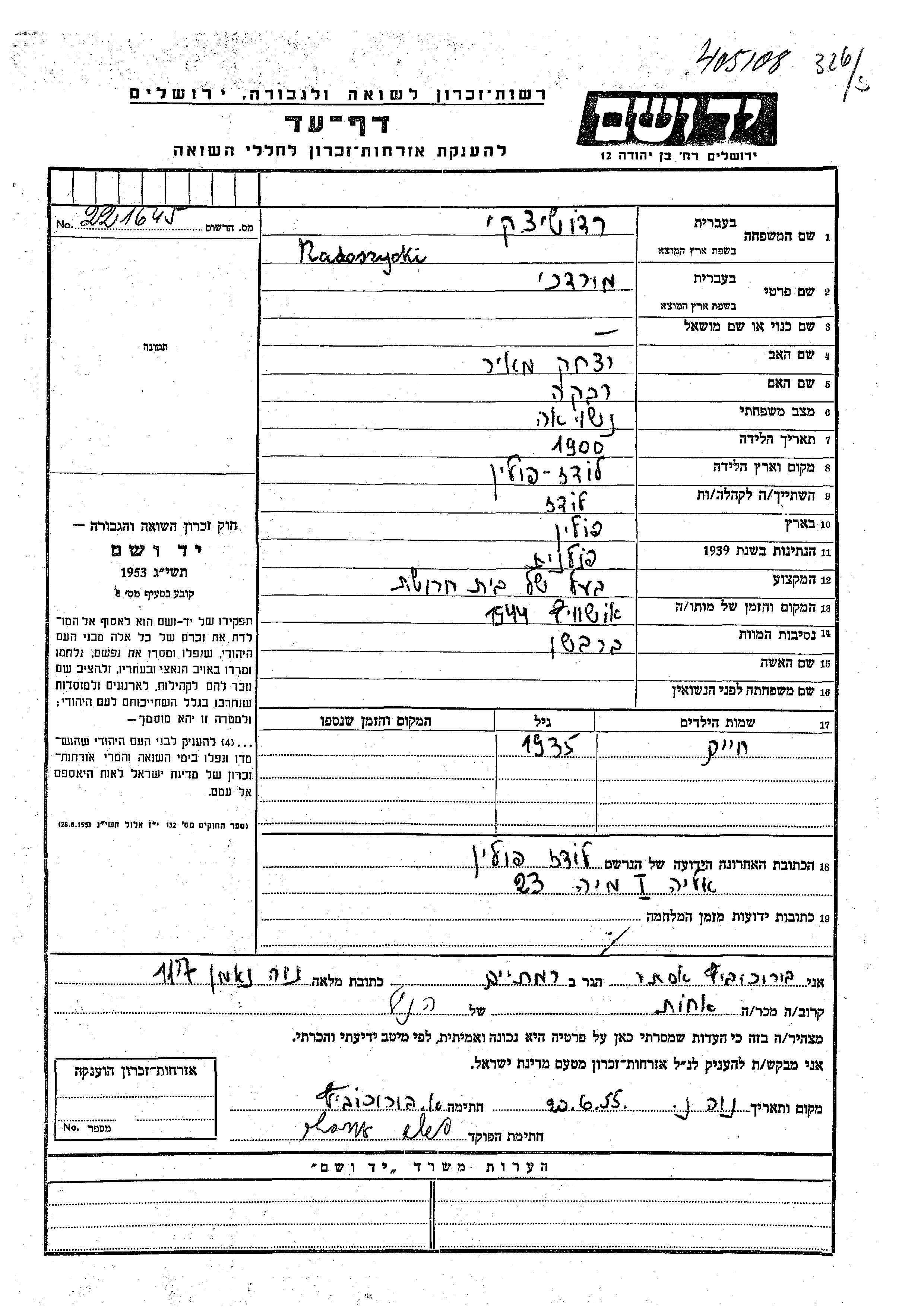 Radoszycki Khaim 1935 Lodz, Pologne Feuille de témoignage